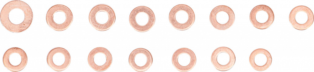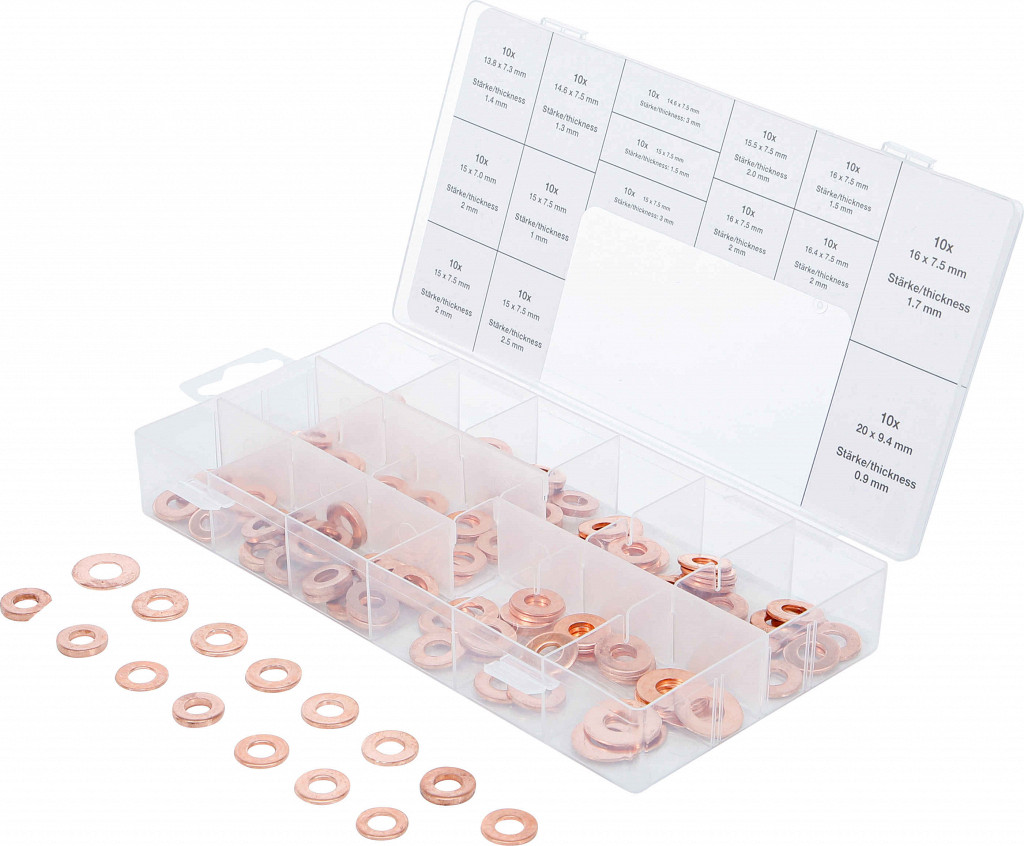 Komplet bakrenih tesnilnih obročkov za šobe pri sistemih Common-Rail CDI iz T2 bakra v plastični škatli: 10 kosov zunanji Ø 13,8 mm notranji Ø 7,3 mm debelina 1,4 mm, 10 kosov Ø 14,6 mm x 7,5 mm debelina 1,3 mm, 10 kosov Ø 14,6 mm x 7,5 mm debelina 3,0 mm, 10 kosov Ø 15,0 mm x 7,0 mm debelina 2,0 mm, 10 kosov Ø 15,0 mm x 7,5 mm debelina 1,0 mm, 10 kosov Ø 15,0 mm x 7,5 mm debelina 1,5 mm, 10 kosov Ø 15,0 mm x 7,5 mm debelina 2,0 mm, 10 kosov Ø 15,0 mm x 7,5 mm debelina 2,5 mm, 10 kosov Ø 15,0 mm x 7,5 mm debelina 3,0 mm, 10 kosov Ø 15,5 mm x 7,5 mm debelina 2,0 mm, 10 kosov Ø 16,0 mm x 7,5 mm debelina 1,5 mm, 10 kosov Ø 16,0 mm x 7,5 mm debelina 1,7 mm, 10 kosov Ø 16,0 mm x 7,5 mm debelina 2,0 mm, 10 kosov Ø 16,4 mm x 7,5 mm debelina 2,0 mm, 10 kosov Ø 20,0 mm x 9,4 mm debelina 0,9 mm.