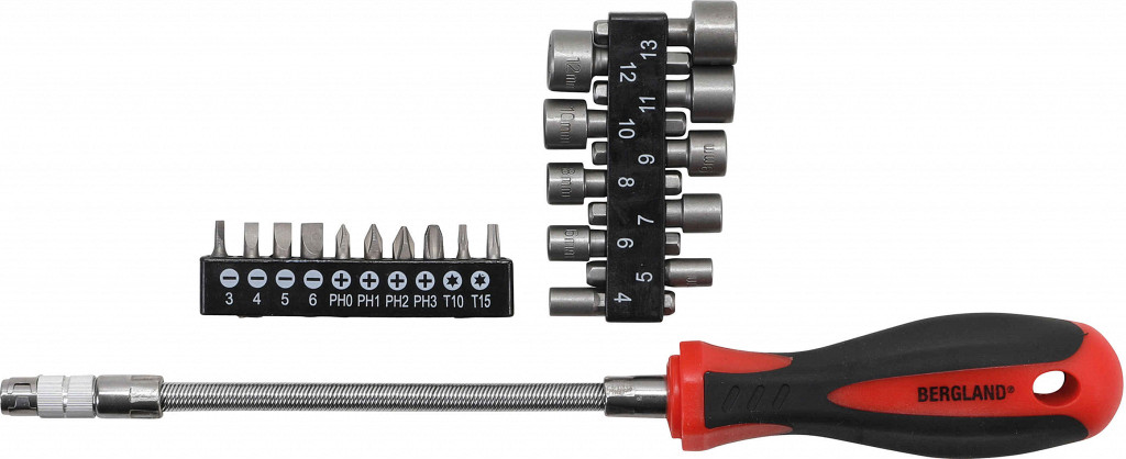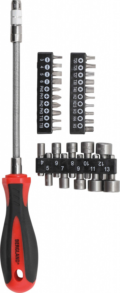 Idealno za težko dostopna mesta: 1 fleksibilni izvijač, 20 nastavkov dolžine 25 mm, 4 nastavki SL: 3 - 4 - 5 - 6 mm, 4 nastavki PH: 0 - 1 - 2 - 3, 7 nastavkov T-Star (Torx): T10 - T15 - T20 - T25 - T27 - T30 - T40, 5 nastavkov notranji šestkotnik: 2 - 2,5 - 3 - 4 - 5 mm, 10 nasadnih ključev dolžine 38 mm: 4 - 5 - 6 - 7 - 8 - 9 - 10 - 11 - 12 - 13 mm