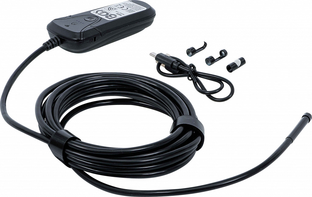 Brezžična endoskopska kamera za pregled težko dostopnih mest v vozilih, gospodinjstvu in industriji. Povezava preko WLAN (Android, iOS), shranjevanje slik in videov neposredno v pametni telefon. Kamera premera 5,5 mm, kot 70°, ločljivost 1280x720. Vključuje kavelj, magnet, ogledalo in zaščitni pokrov. Vodotesnost IP67 (kamera in gibljiva cev). Delovanje 2–3 h.