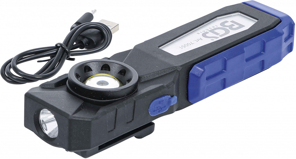 Delovna LED svetilka s 4 načini osvetlitve (zgornja luč, glavna luč, rdeča luč, rdeča utripajoča), zvezno nastavljiva svetilnost, rdeča luč z nastavljivo frekvenco utripanja, indikator polnjenja, 360° vrtljiv kavelj, močan magnet na dnu in zadnji strani, 180° nastavljivo stojalo, notranji navoj 1/4" za stojalo, USB-A vtičnica za polnjenje mobilnih naprav, glavna luč 10W COB LED (500 lm), zgornja luč 3W SMD LED (170 lm), čas delovanja 3–4 ure, polnjenje 5V 1A (Micro-USB), vgrajena polnilna baterija 18650.