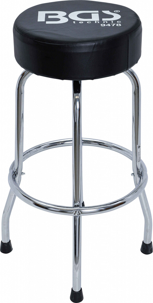 Delavniški vrtljivi stol z oblazinjenim sedežem v usnjenem videzu. Stabilna konstrukcija iz okroglih cevi, gumirane noge za varen oprijem, opora za noge. Sedež iz PU pene. Primeren za domačo in delavniško uporabo.