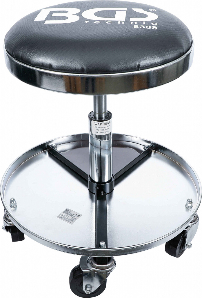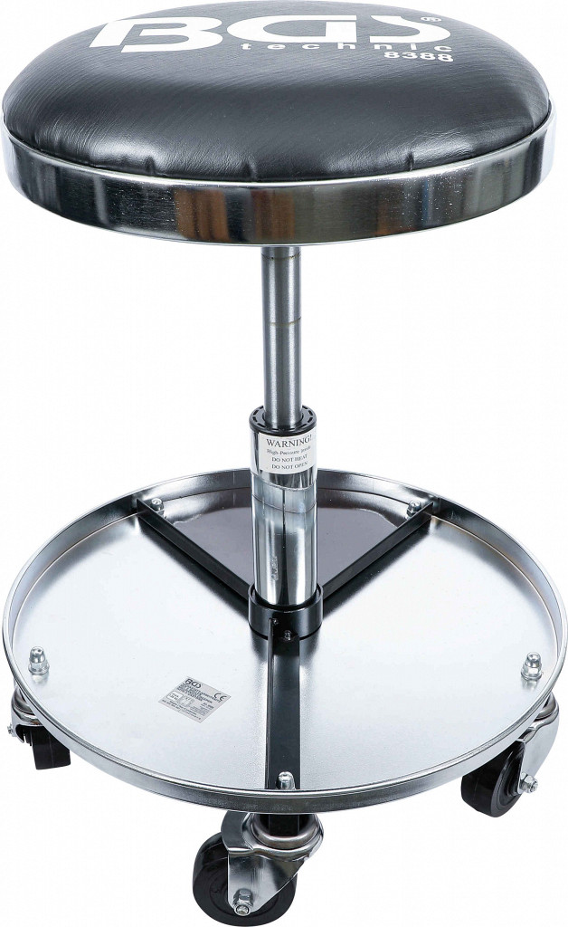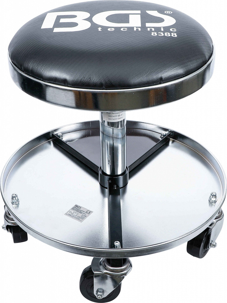 Oblazinjen stolček z velikim prostorom za shranjevanje v osnovi. Višina nastavljiva s hidropnevmatskim dvigom od 450 do 580 mm. Sedež Ø 360 mm, odlagalna polica Ø 440 mm.