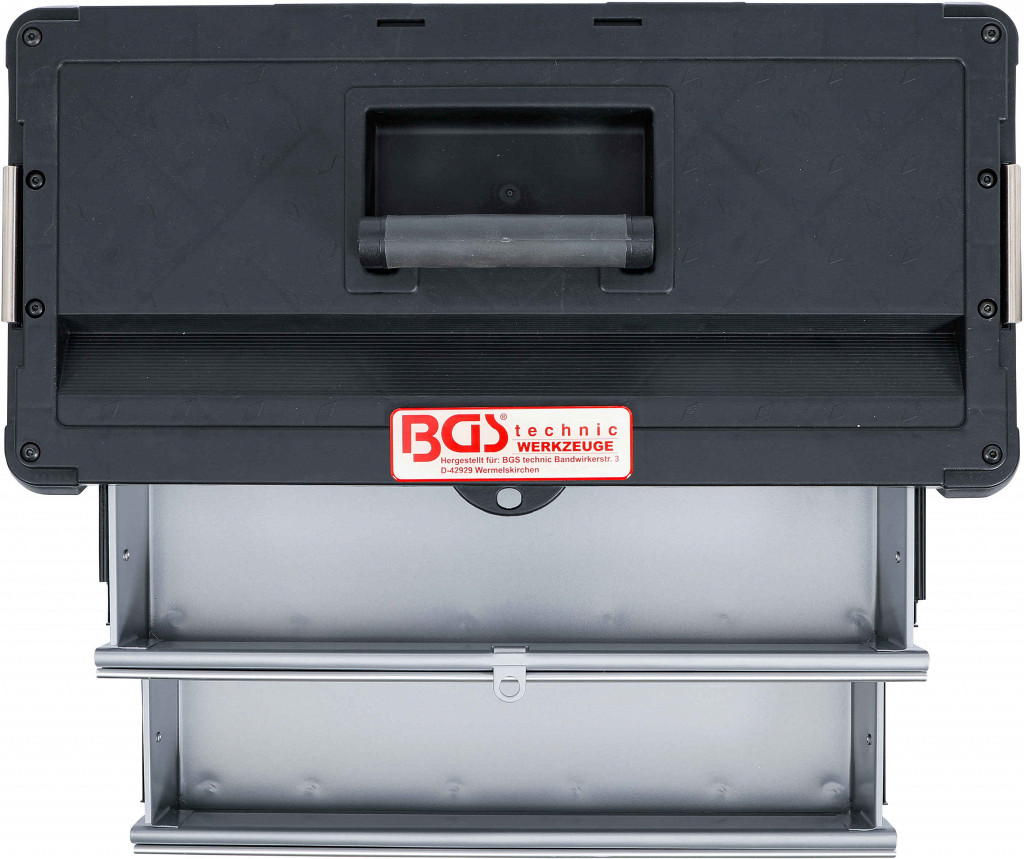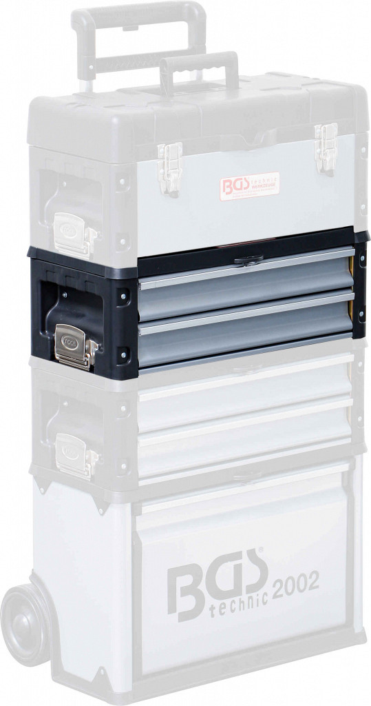 Primeren za mobilni voziček BGS 2002. Močan kovček iz udarno odporne plastike in jeklene pločevine. Večnamenska notranjost z dvema predaloma. Zapiranje ob strani z dvema zaskokoma. 1 zložljiv plastični ročaj. Notranje dimenzije predalov (š × v × g): 390 × 210 × 60 mm.
