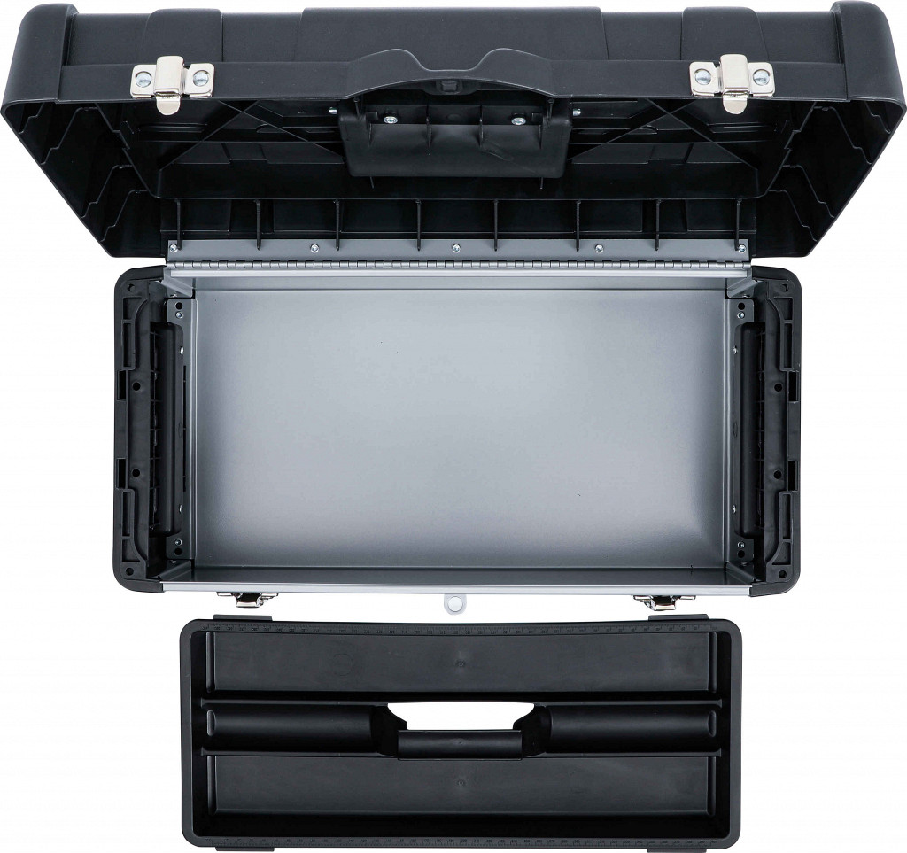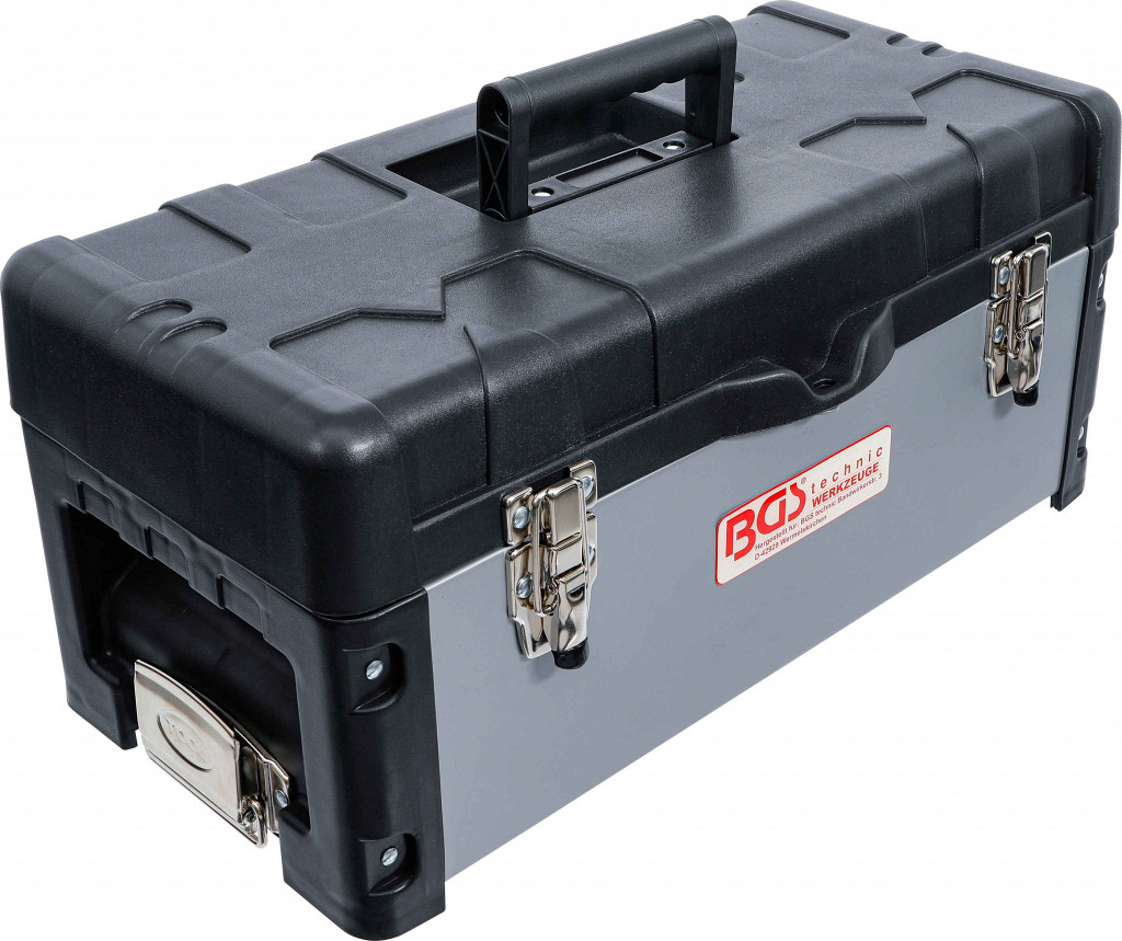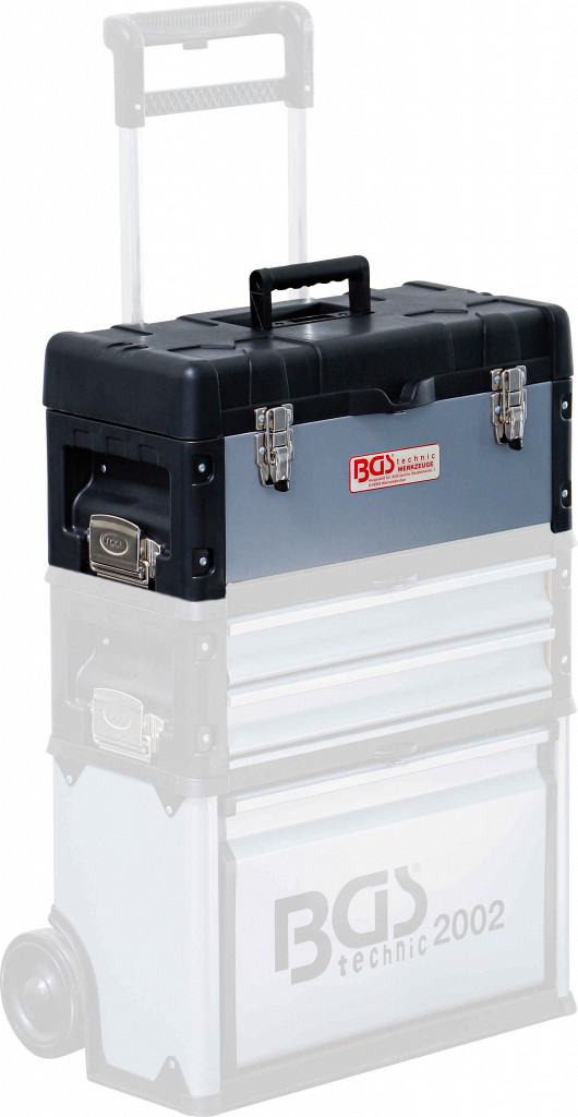 Primeren za mobilni servisni voziček BGS 2002. Močan kovček iz udarno odporne plastike in jeklene pločevine. Idealno za monterje, mehanike, električarje ipd. Zapiranje ob strani z dvema zaskokoma. 1 zgornji plastični ročaj. Večnamenska notranjost z ločenim vložkom s predelki za drobne dele.