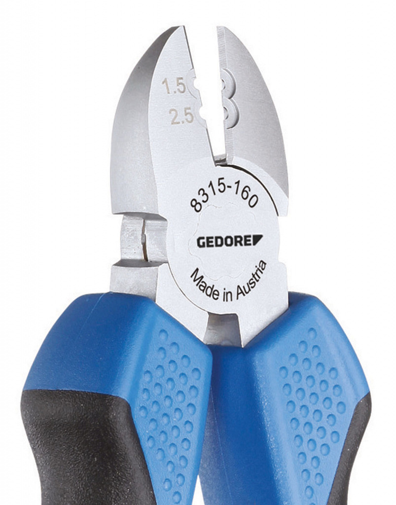 Z dvojno funkcijo: za rezanje in pobiranje izolacije. Zareze za pobiranje enojne in večplastne izolacije, 1.5 mm2 in 2.5 mm2 prerez prevodnika. Indukcijsko kaljeno rezilo, trdota 61 - 63 HRC. GEDORE specialno ojačano i kaljeno jeklo, kovano, razbeljeno oljno kaljeno. JC = kromiran, z 2 komponentni ročajem. Model TC = kromirane z modro plastično zaščito ročajev.