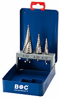 Set 3 stopničastih svedrov HSS z spiralo v kovinski škatli