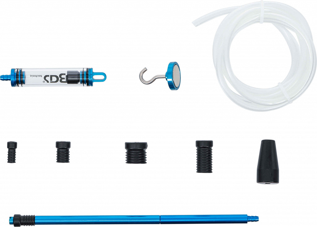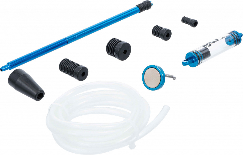 Merilnik za določanje zgornje mrtve točke (TDC) pri motorjih brez oznak. Vsebina: merilna enota z magnetom, priključne cevi z adapterji za svečke/glow plug 8–18 mm, univerzalni konus, aluminijaste cevi.