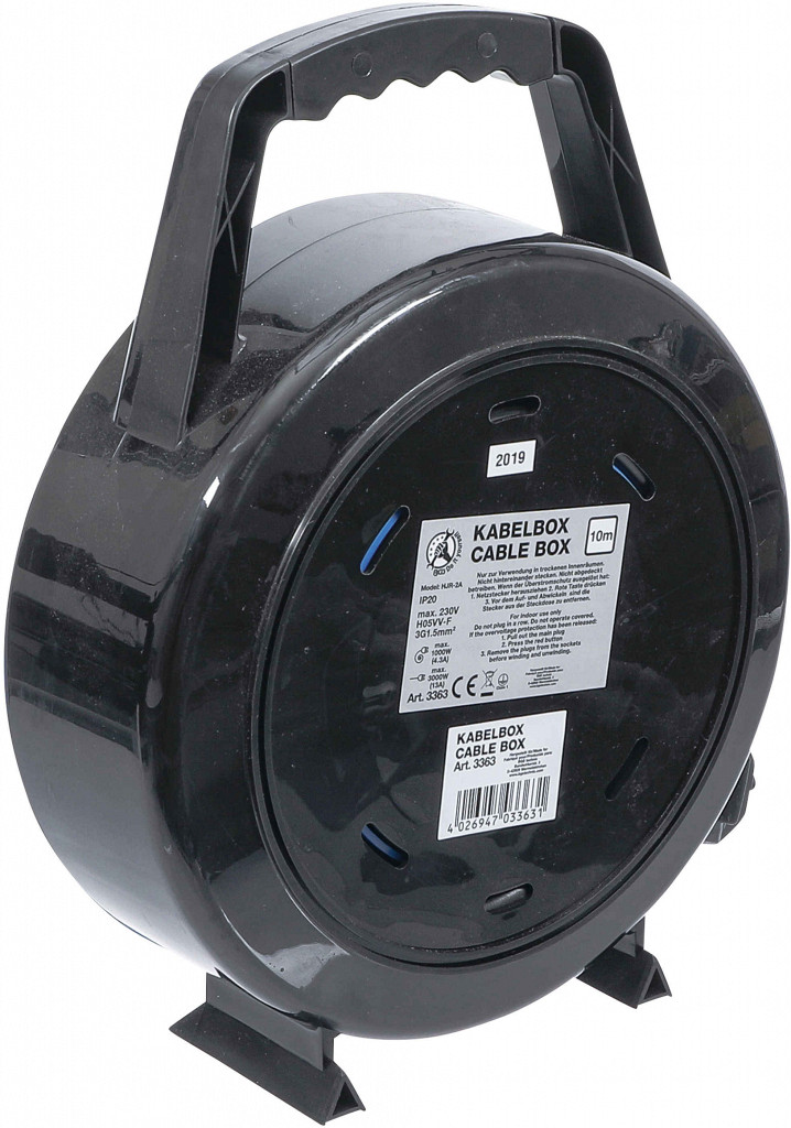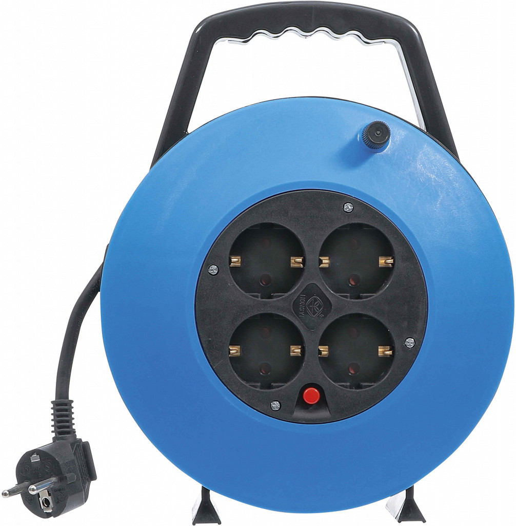 S termičnim zaščitnim stikalom proti pregrevanju, lahek in enostaven kabelski kolut za notranjo uporabo v gospodinjstvu, pisarni ali prikolici, z ročajem za prenašanje in stabilnim dvojnim stojalom, ohišje iz plastike, tok (navit): največ 4,3 A, tok (odvit): največ 13 A, moč (navit): največ 1000 W, moč (odvit): največ 3000 W, število vtičnic 4, vtič pod kotom, zaščitni razred 1, tip vtiča CEE 7/7, kabel tipa H05VV-F.