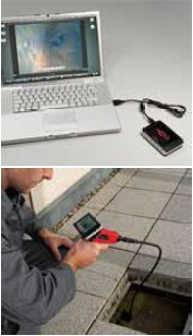 Brezžični prenos slike! Shranjevanje podatkov na MikroSD kartico! USB in video priključek! Baterijsko in omrežno napajanje! Mobilni priročni kamera-endoskop z daljinsko tehniko za briljantne slike in video posnetke iz votlin, jaškov in cevi. s snemanjem govora. Za akumulatorsko in omrežno obratovanje. ROLLER