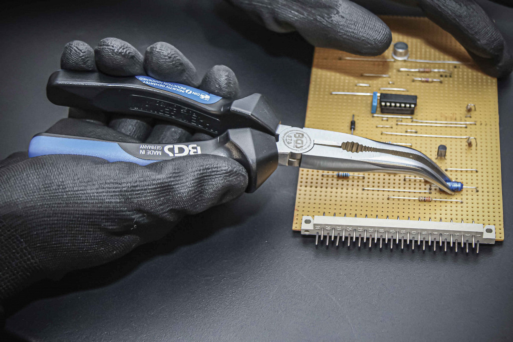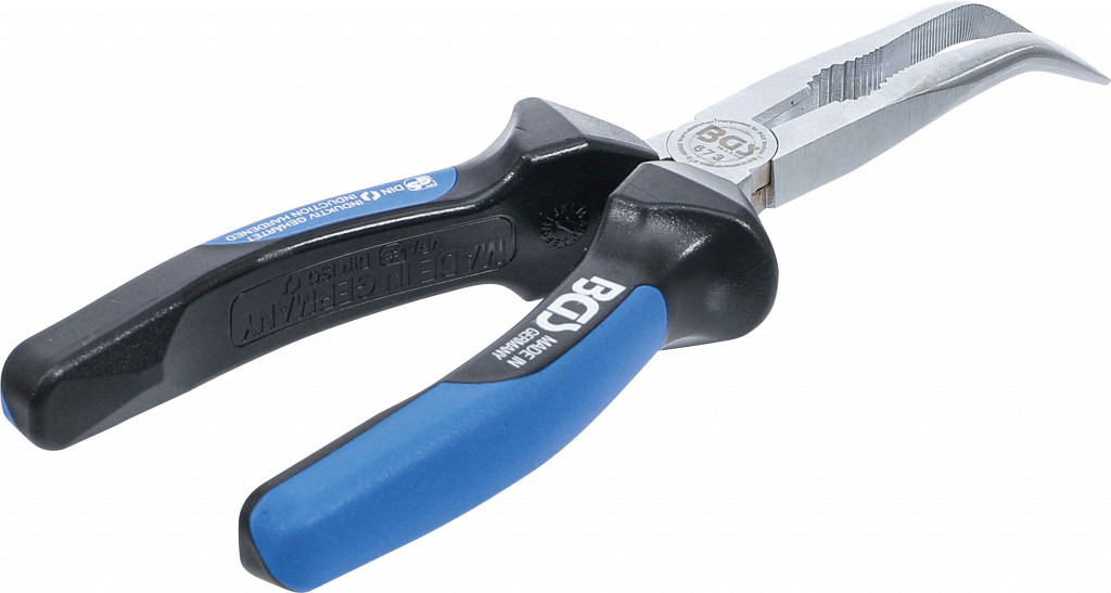 Kovane dolgonosne klešče, ukrivljena oblika 45°, indukcijsko utrjeni robovi, izdelano v Nemčiji.