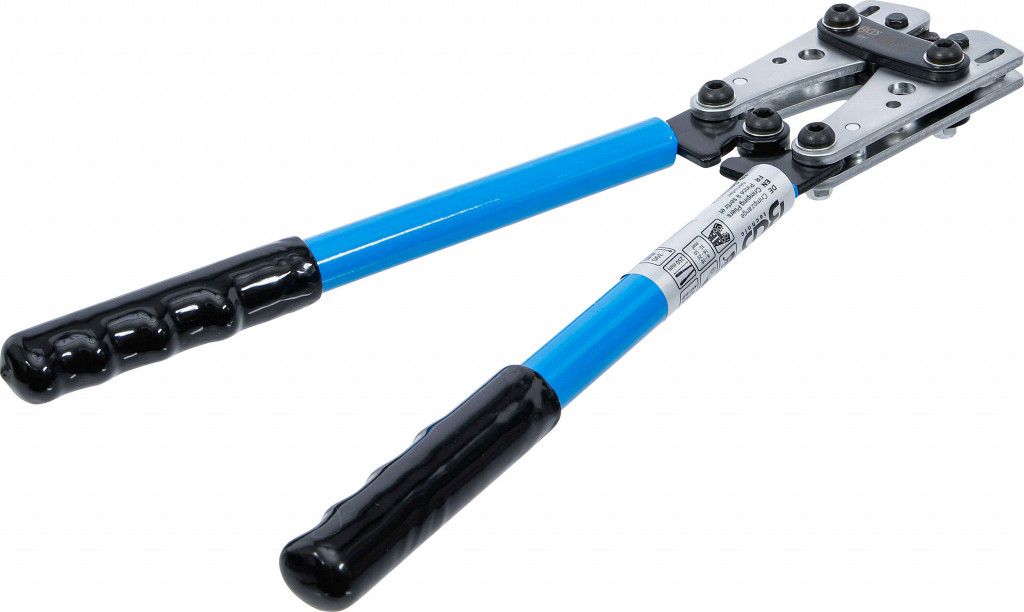 Klešče za stiskanje z 6-točkovnim profilom, za kabelske čeveljčke, vzporedne konektorje, za bakrene in aluminijaste kable 6–50 mm², zamenljive matrice, nedrseči izolirani ročaji, dolžina 390 mm.