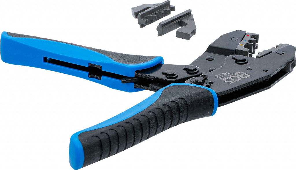 Set klešč za stiskanje z ragljo; vključuje 2 zamenljivi čeljusti za: izolirane zaključne čepe 0,5–6 mm² (rdeče-modro-rumene) z ovalnim stiskanjem in neizolirane zaključne čepe 1,5–10 mm² z mandrelnim stiskanjem.