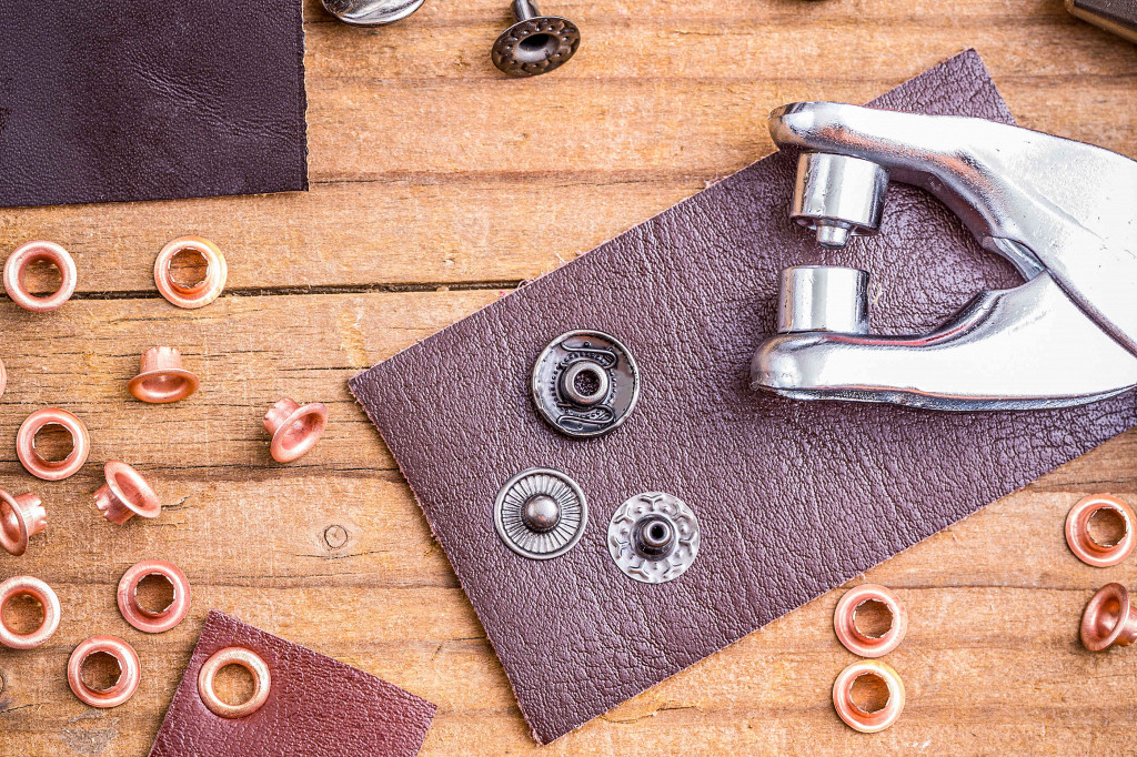 Za prebijanje lukenj in stiskanje očescev v usnje, tekstil ali gumijaste vezistabilne glave klešč z napravo za prebijanje lukenj in fiksno globinsko zaporo, vključno z 100 okroglih očescev, Ø 5,0 mm