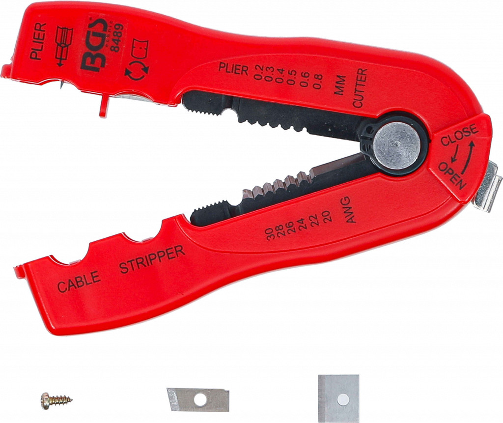 Klešče za snemanje izolacije z žic premera 0,2–0,8 mm, z natančnimi rezili, oznakami, vzmetnim odpiranjem, priloženi 2 rezervni rezili, ABS ohišje.