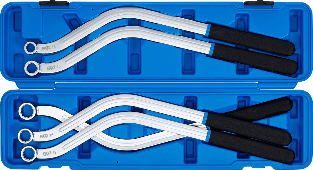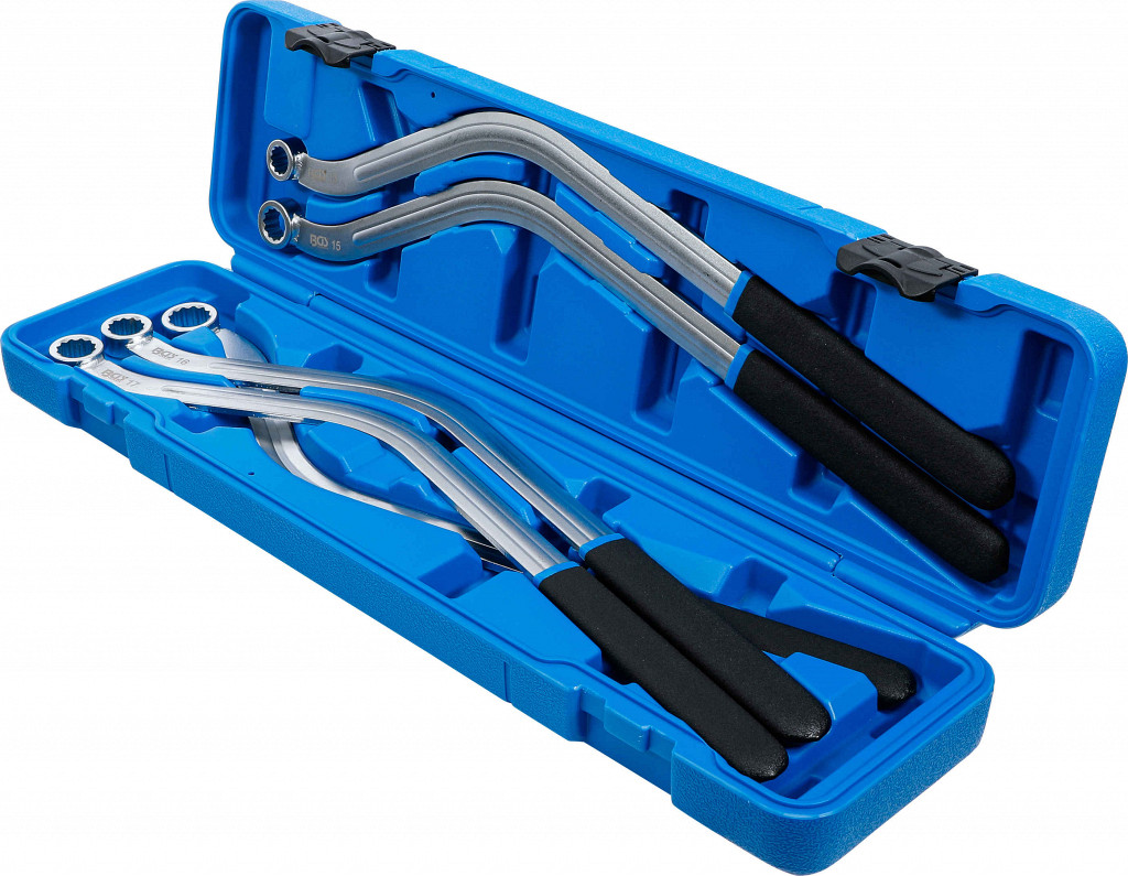 Orodje je dvojno ukrivljeno za boljši doseg na ozkih mestih. Ima ročaj proti zdrsu za enostavno uporabo. Obseg dobave: ključi za napenjalne jermenice 12-robni 13, 15, 16, 17 in 19 mm.