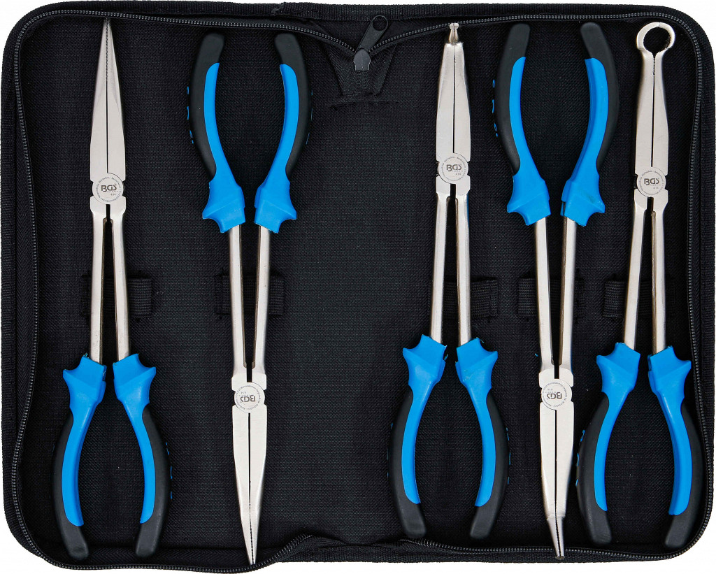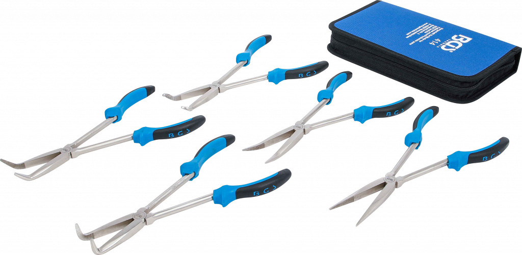 Komplet klešč z 2-komponentnimi ročaji v torbici z zadrgo. Obseg dobave: ravne dolge klešče 0°, dolge klešče 20°, 45°, 90° in klešče za svečke.