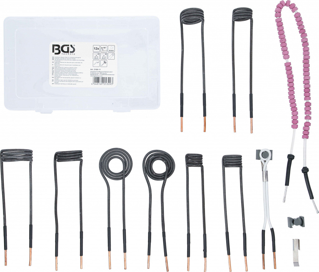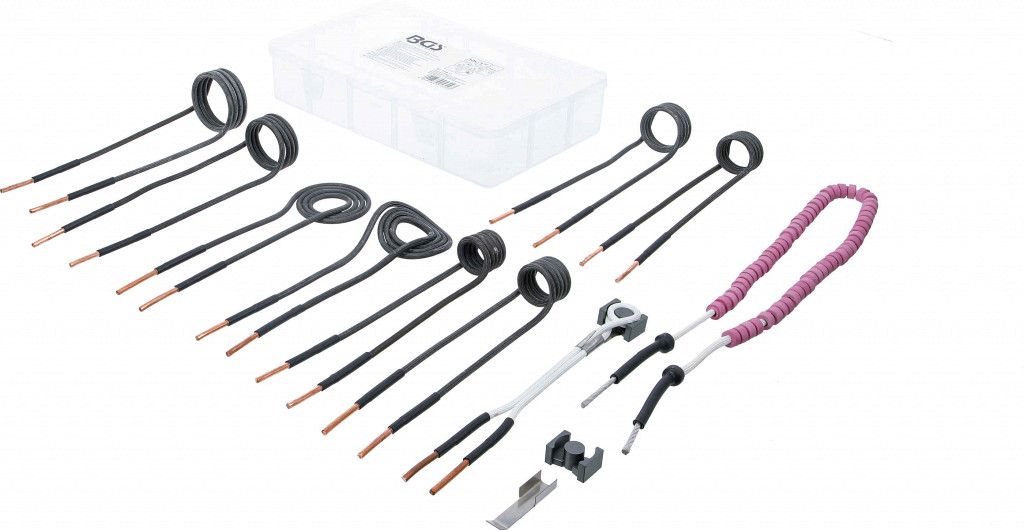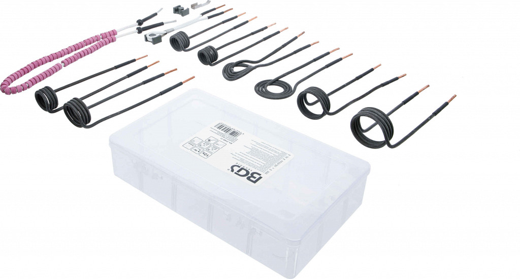 Za segrevanje vijakov, matic, gredi ipd., primerno za indukcijske grelce BGS 2169, 3390, 3391. V obsegu: indukcijska tuljava ploščata, tuljava za končnike, tuljava za majhne površine, feritno jedro, vzmet za pritrditev, tuljava s keramično zaščito, tuljave 20–45 mm pod kotom 90°.