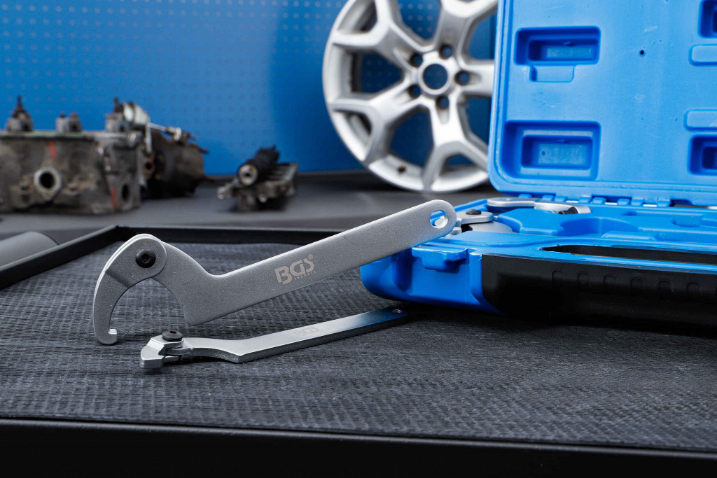 Kljukasti ključ z zamenljivim kavljem in čepom, primeren za utorne matice DIN 1804 in ležajne matice DIN 981, za premere 35–60, 60–90, 90–120 mm.