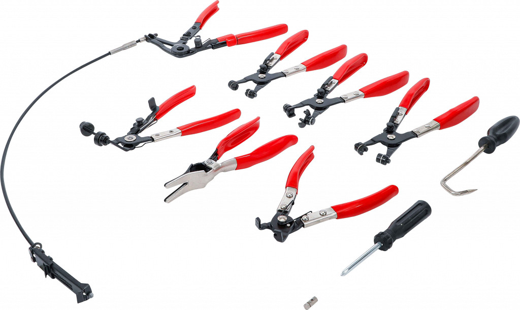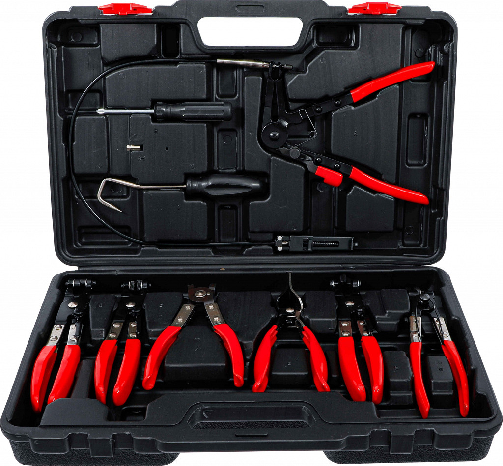 Za popuščanje/zategovanje objemk cevi, primerno za večino evropskih, ameriških in azijskih vozil, obseg dobave: klešče za objemke cevi, vrtljive klešče za vzmetne objemke, klešče za trakaste objemke, klešče za trakaste objemke pod kotom, klešče za odklop cevi, klešče za gorivne cevi, izvijač, orodje za odpiranje cevi