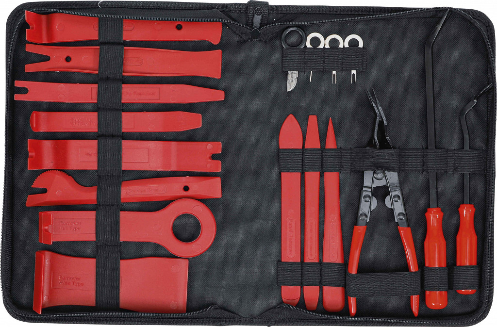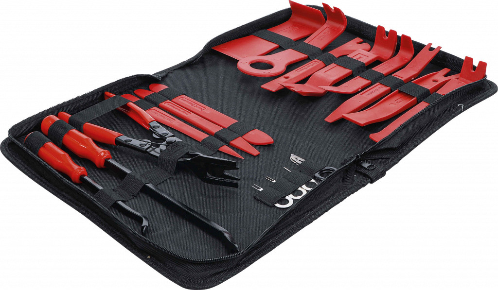 Za razstavljanje avtomobilskih oblog, plastičnih sponk, pokrovov, opažev, vzvratnih ogledal itd.popolno za uporabo na težko dostopnih mestih in celo na barvanih površinahširok spekter aplikacij z različnimi orodji za razstavljanje. 11 plastičnih orodij za razstavljanje, ojačanih s steklenimi vlakni, v različici z režami, ravno in kotno, za razstavljanje letev, ogledal, pokrovov in plošč v notranjosti in na kleščah za sprostitev plošče karoserije, dolžine 245 mm, za sprostitev sponk za obloge vrat, dolžina 220 mm, pod kotom 45 stopinj z režo 6 mm, za demontažo npr. vrat in notranjih plošč orodje za sprostitev obloge vrat, dolžina 310 mm, pod kotom 45 stopinj z režo 7 mm, za demontažo npr. vrat in notranjih plošč2 radijskih izvlečnih kljuk, za radijske postaje z dvema režama za odklepanje 9x1 mm, primerno za npr. Becker, Blaupunkt, Alpine, Mercedes-Benz, Škoda, Audi, Ford in mnoge druge3 orodja za sprostitev stikov za avtoradio, za demontažo kontaktov v ISO in Mini ISO vtičih in preprosto zaklenjenih kontaktih v drugih vtičih za avtoradio v žepu z zadrgo