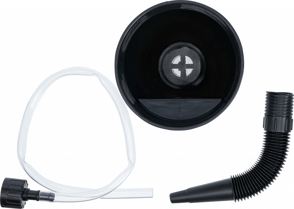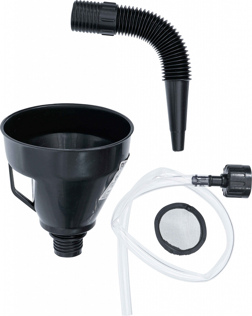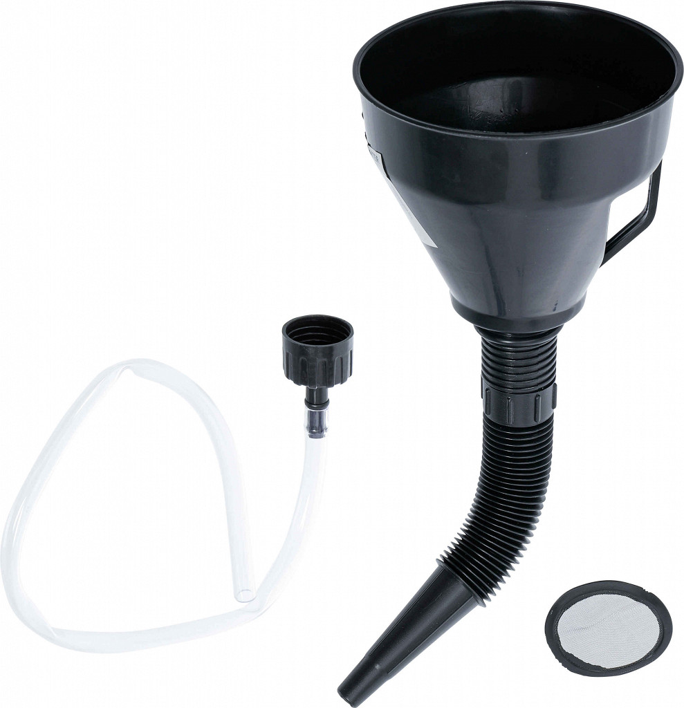 Posoda za olje z lijakom in sitom, visokim robom proti razlitju, gibljivo iztočno cevjo in prozorno cevjo, gibljiv vrat dolžine 375 mm.