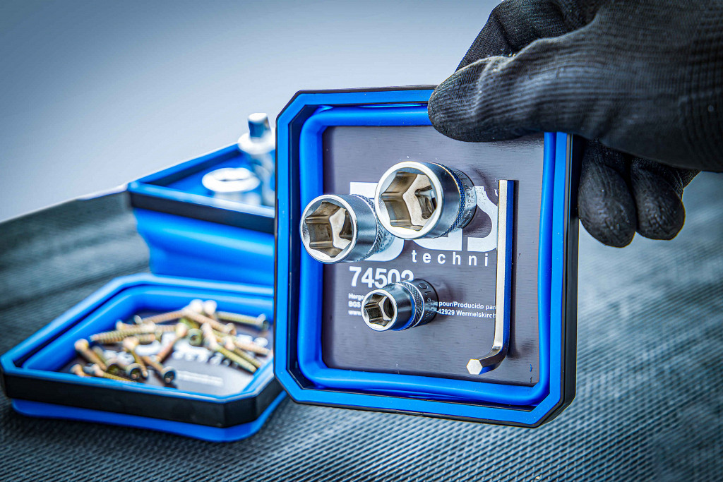 Nastavljiv sistem magnetnega orodja za organizatorjekompaktna, zložljiva zasnovaza uporabo v delavnici in okoli domaprimerna za kolesarske mehanike, avtomobilske tehnike, električarje, draguljarje, modelarje in hobistepreprosto zložite in zložite, ko jih ne uporabljate, da prihranite dragocen delovni prostorz močnim magnetom na dnu za varno shranjevanje vijakov, matic, žebljev in drugih majhnih delov posamezni pladnji so opremljeni s fleksibilnim in nastavljivim okvirjem, ki olajša odstranjevanje majhnih delov iz trpežen, toplotno odporen in enostaven za čiščenje silikonski materialojačan ovratnik iz plastike (ABS) gumirana podlaga za zaščito površine. 4 magnetne lupine | silikonDimenzije skupaj: 115 x 115 x 50 mmDimenzije zloženega: 115 x 115 x 20 mmmax. nosilnost: 1,25 kg / kom