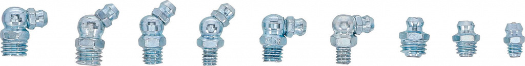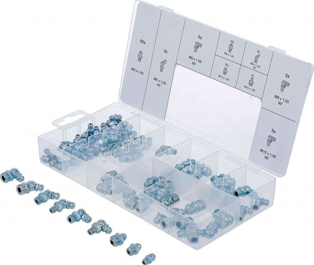 Komplet mazalnih nastavkov (ravni, 45° in 90°): 60 kosov M6 x 1.00 ravni, 5 kosov M6 x 1.00 45°, 5 kosov M6 x 1.00 90°, 10 kosov M8 x 1.25 ravni, 5 kosov M8...