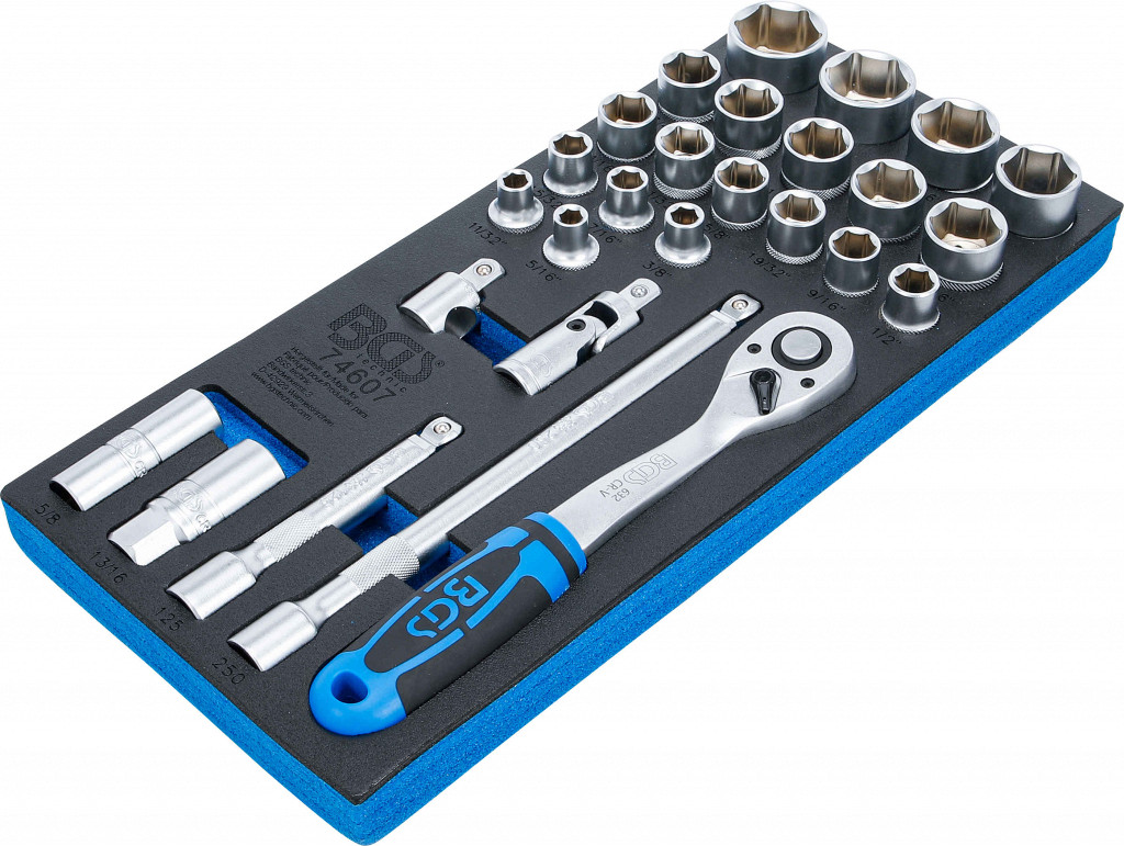 Bogato opremljen za zahtevne mehanike in domače mojstre s šesterokotnimi Pro navtičnimi® vtičnicami v kratki izvedbivisokokakovostni reverzibilni zaskočni z 90 zobmi, vstavljeno reverzibilno ročico, ergonomskim dvokomponentnim ročajem in gumbom za hitro sprostitev za hitro menjavo orodja med drugim vsebuje še različne elemente upravljanja, kot so podaljški in univerzalni spoj za pokrivanje različnih vijačnih aplikacij, tudi na težko dostopnih mestih z nareznimi vtičnicami, podaljški, reverzibilna zaskočnica in univerzalni spoj iz krom-vanadijevega jeklaplastoj za orodje iz visoko odporne peneorodja so zaščitena v pladnju iz trde pene in so shranjena v vdolbinah na nedrseč načinvsako posamezno orodje ima svoje ustrezno mestoprimerno za vse kombinacije delavniških vozičkov in skladiščnih sistemov BGS.obseg dobave:. 1 vtičnica, šesterokotna | 12,5-milimetrski (1/2-palčni pogon) | 5/16"1 vtičnica, šesterokotnik | 12,5-milimetrski (1/2-palčni pogon) | 11/32"1 vtičnica, šesterokotnik | 12,5-milimetrski (1/2-palčni pogon) | 3/8" (BGS 2770)1 vtičnica, šesterokotnik | 12,5-milimetrski (1/2-palčni pogon) | 7/16" (BGS 2771)1 vtičnica, šesterokotnik | 12,5-milimetrski (1/2-palčni pogon) | 15/32"1 vtičnica, šesterokotnik | 12,5-milimetrski (1/2-palčni pogon) | 1/2" (BGS 2772)1 vtičnica, šesterokotnik | 12,5-milimetrski (1/2-palčni pogon) | 9/16" (BGS 2773)1 vtičnica, šesterokotnik | 12,5-milimetrski (1/2-palčni pogon) | 19/32"1 vtičnica, šesterokotnik | 12,5-milimetrski (1/2-palčni pogon) | 5/8" (BGS 2774)1 vtičnica, šesterokotna | 12,5-milimetrski (1/2-palčni pogon) | 21/32"1 vtičnica, šesterokotnik | 12,5-milimetrski (1/2-palčni pogon) | 11/16" (BGS 2775)1 vtičnica, šesterokotnik | 12,5-milimetrski (1/2-palčni pogon) | 3/4" (BGS 2776)1 vtičnica, šesterokotnik | 12,5-milimetrski (1/2-palčni pogon) | 25/32"1 vtičnica, šesterokotnik | 12,5-milimetrski (1/2-palčni pogon) | 13/16" (BGS 2777)1 vtičnica, šesterokotnik | 12,5-milimetrski (1/2-palčni pogon) | 7/8" (BGS 2778)1 vtičnica, šesterokotnik | 12,5-milimetrski (1/2-palčni pogon) | 15/16" (BGS 2779)1 vtičnica, šesterokotnik | 12,5-milimetrski (1/2-palčni pogon) | 1" (BGS 2787)1 vtičnica, šesterokotnik | 12,5-milimetrski (1/2-palčni pogon) | 1,1/16" (BGS 2784)1 vtičnica, šesterokotnik | 12,5-milimetrski (1/2-palčni pogon) | 1,3/16"1 vtičnica, šesterokotnik | 12,5-milimetrski (1/2-palčni pogon) | 1,1/4" (BGS 2786)1 vtičnica za vžigalno svečko, šesterokotnik | 12,5-milimetrski (1/2-palčni pogon) | 5/8"1 vtičnica za vžigalne svečke, šesterokotna | 12,5-milimetrski (1/2-palčni pogon) | 13/16"1 nihajna podaljšek | 12,5 mm (1/2") | 125 mm (BGS 234)1 nihajna podaljšek | 12,5 mm (1/2") | 250 mm (BGS 235)1 drsni adapter za podaljške | zunanji kvadratni 12,5 mm (1/2") (BGS 289)1 univerzalni spoj | 12,5 mm (1/2") (BGS 251)1 reverzibilna zaskočnica | fini zob | 6,3 mm (1/4") (BGS 630)