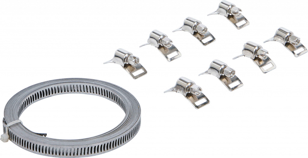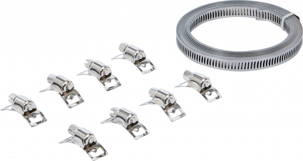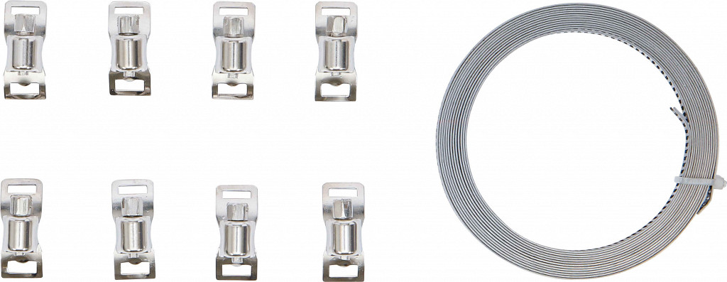 vsestranska uporaba zaradi 3 m neskončnega traku; širina traku 8 mm; lahko se oblikuje v objemke poljubnih velikosti; vključno z 8 zapirali.