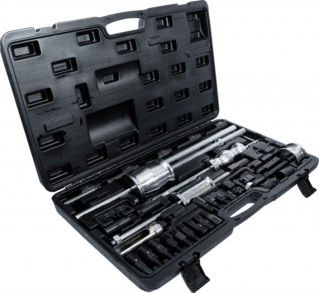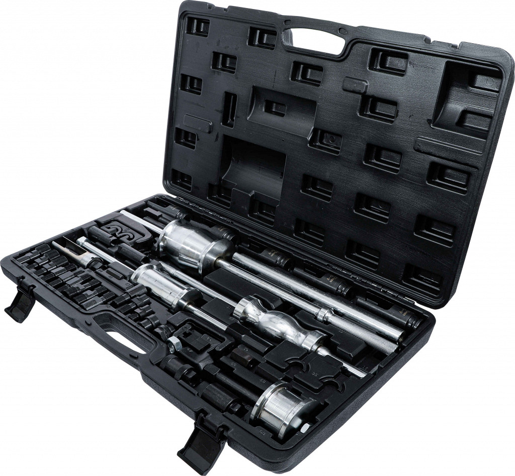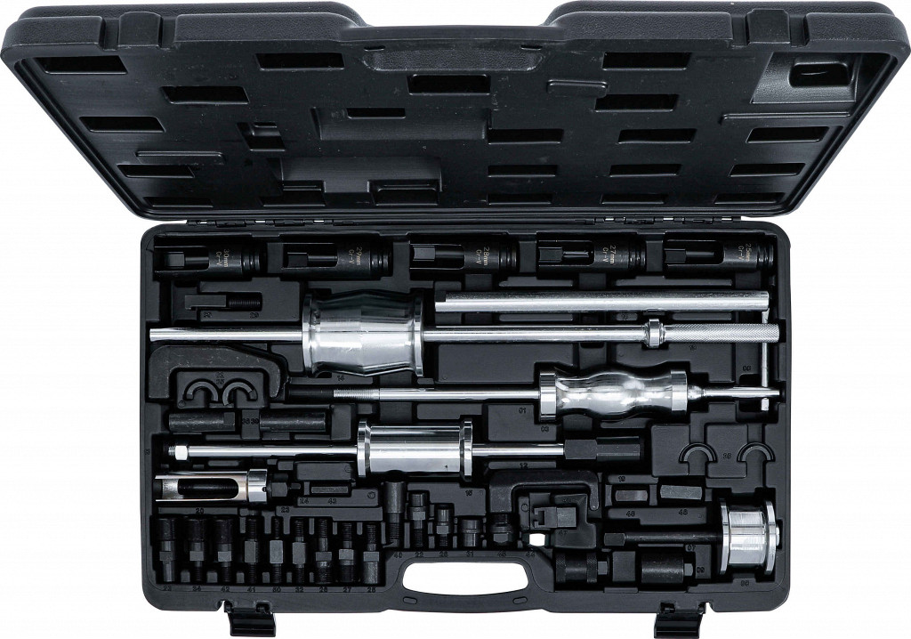 Komplet za montažo in demontažo dizelskih injektorjev. Vsebina: 3 različna udarna kladiva, snemalne vilice, nasadni ključi, izvlekači in adapterji za večino injektorjev.