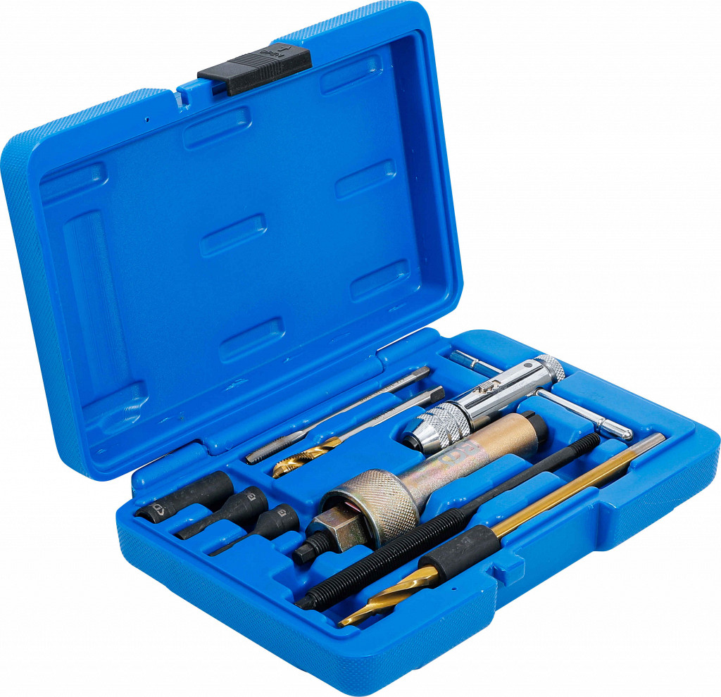 Set za odstranjevanje zlomljenih žarilnih svečk M9 x 1.0. Primerno za Fiat motorje. Vsebina: stopničasti sveder z omejilnikom, navojni svedri, vtičnice, držalo in izvlekač.