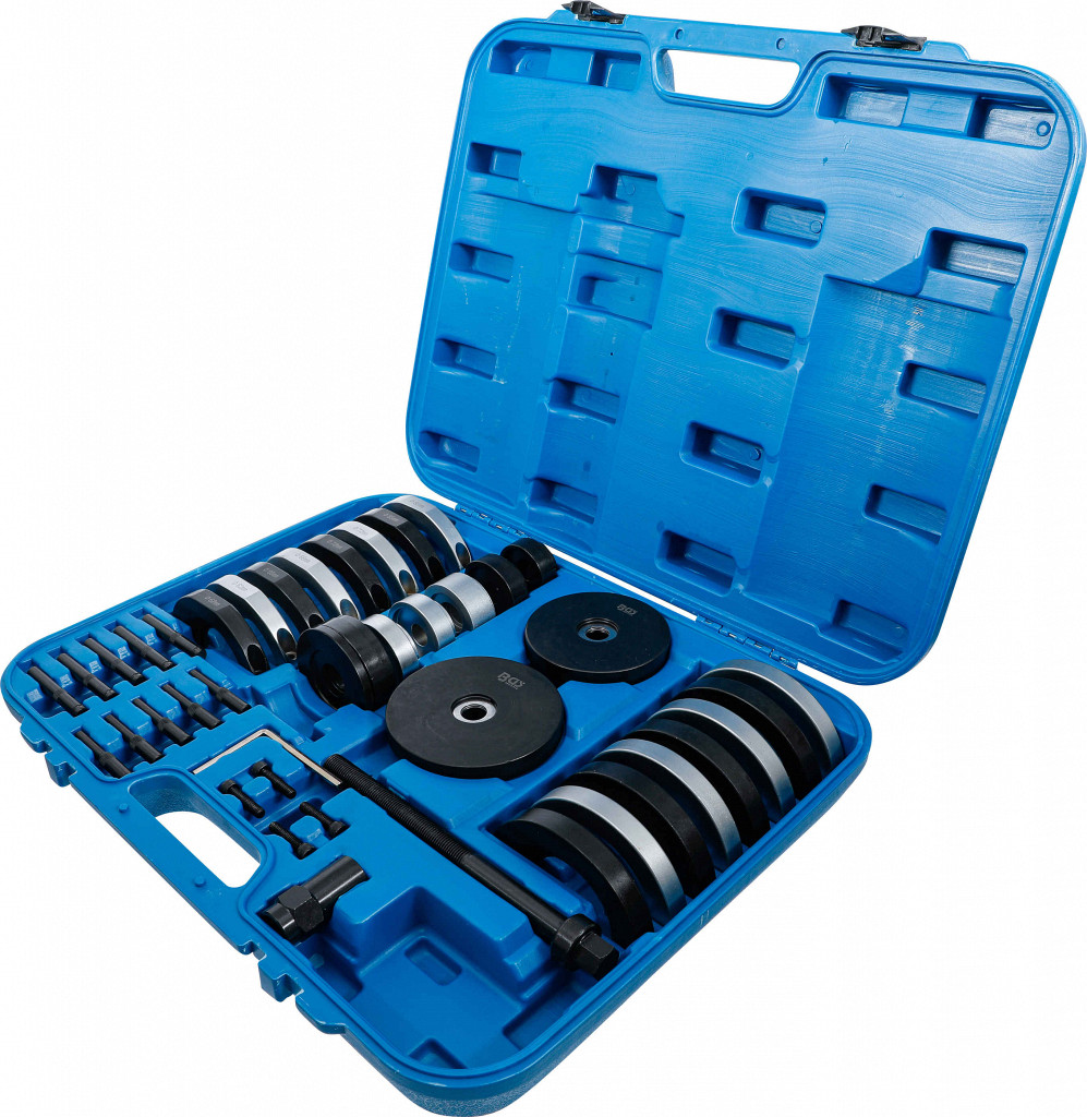 Za demontažo in montažo pestnih ležajev 62–85 mm na vozilih VAG (Audi A2, VW Lupo, Polo, Fox, Multivan, T6, Transporter, Touareg, Škoda Roomster, Seat Arosa, Cordoba, Ibiza), vključno s kompletom vreten, ploščami in nastavki.