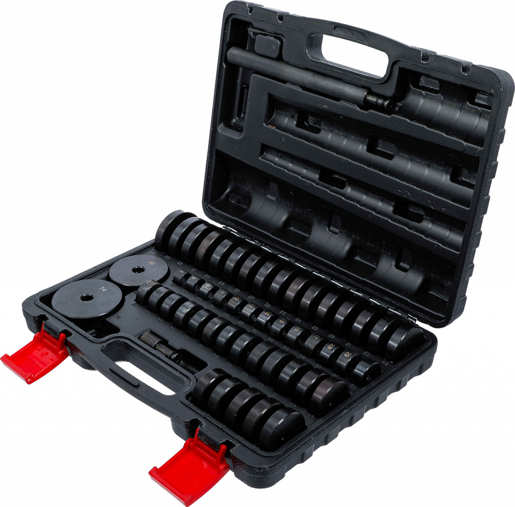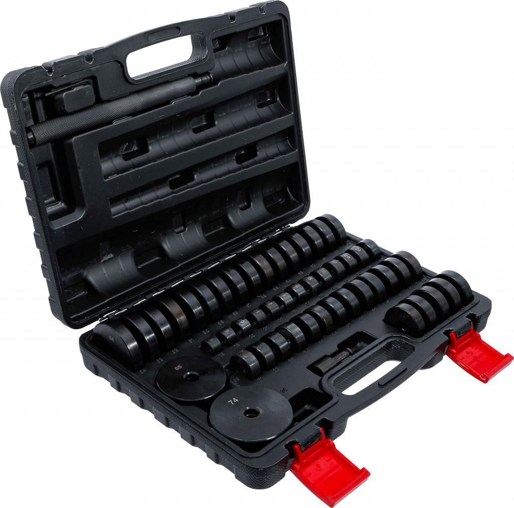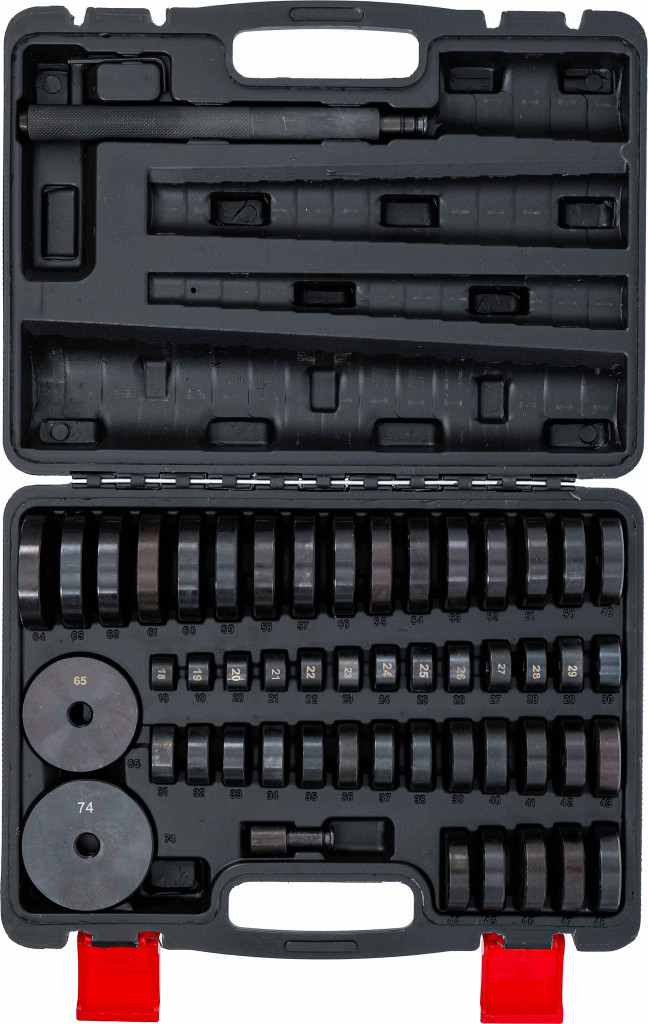 Primerno za montažo ohišij ležajev, tesnilnih obročev in gumijastih trakov, še posebej koristno pri uporabi s hidravličnimi stiskalnicamivključuje tlačne čistilnike s kovinskim ročajem Ø 18 - 65 mm (koraki po 1 mm) in kovinskim ročajem Ø 74 mm180 mm x Ø 12 mm, za uporabo s kladivom