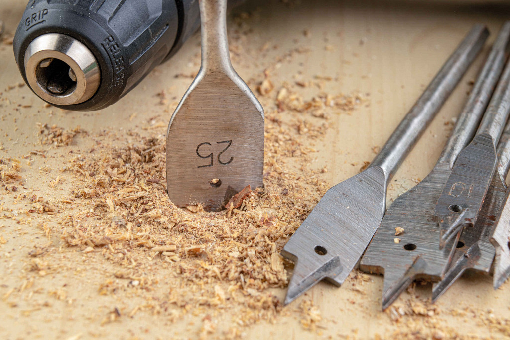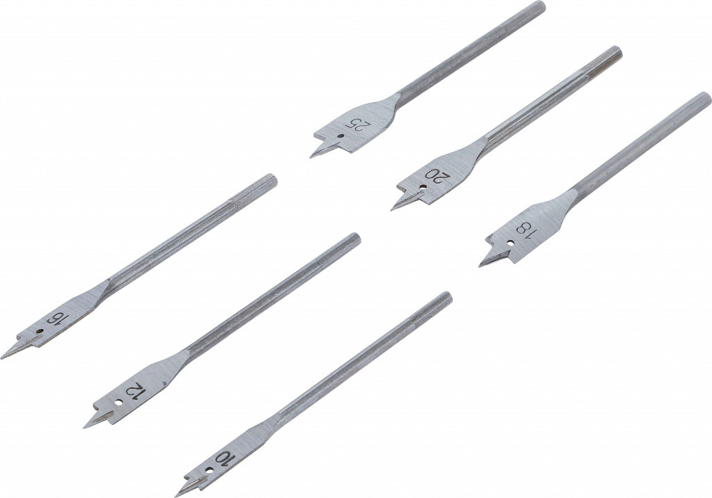 Set ploščatih svedrov za plitve luknje v mehki in srednje trdi les, primeren tudi za električarje in monterje pri polaganju kablov in cevi, z ostro konico in rezili pod kotom za hitro in čisto vrtanje, posebej utrjeni, označene dimenzije na svedrih, šesterokotno steblo, obseg premerov: 10, 12, 16, 18, 20, 25 mm