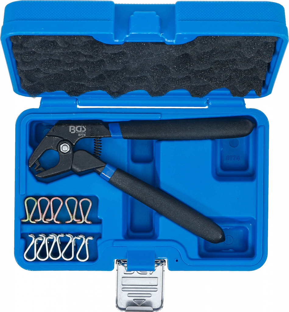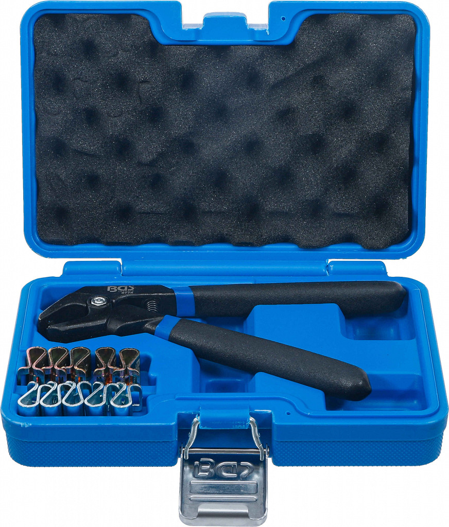 Komplet klešč za hitro pritrjevanje pri lepljenju in varjenju karoserijskih delov, prihranek časa in stroškov, vključuje 10 univerzalnih jeklenih spon, odpiranje 0–5 mm, klešče ukrivljene oblike za težko dostopna mesta.