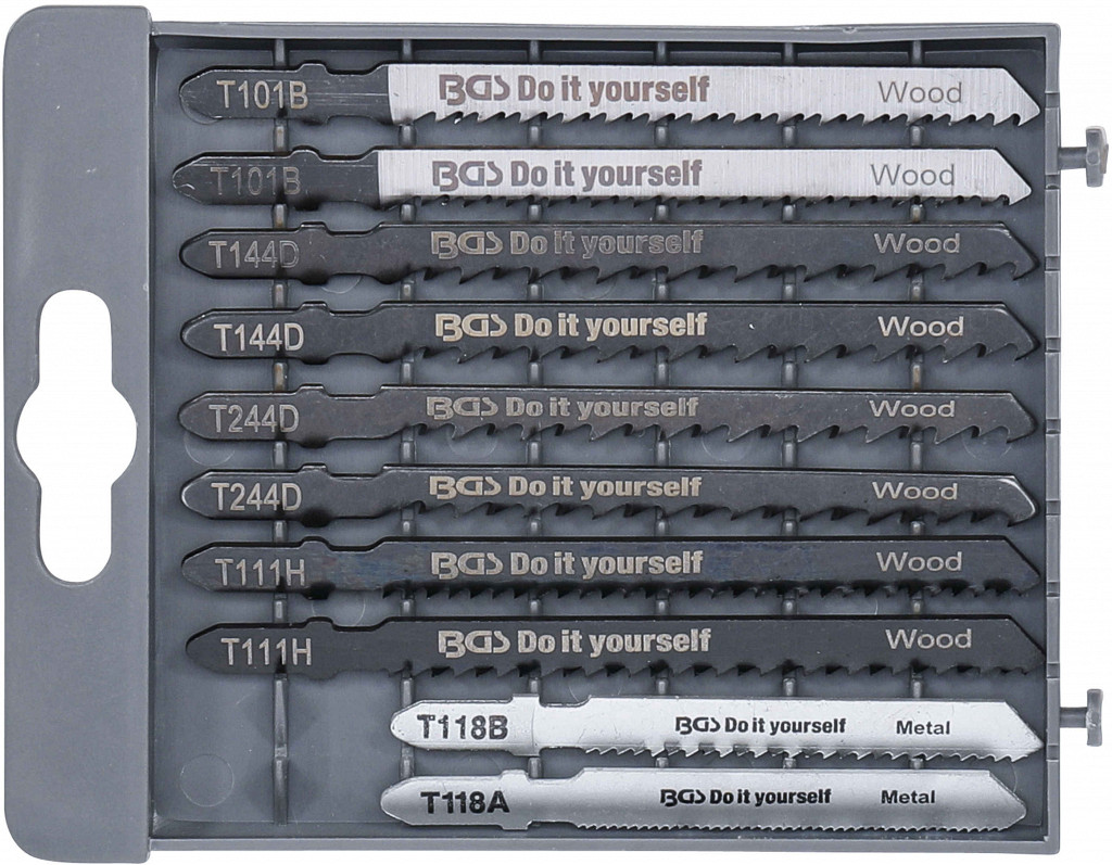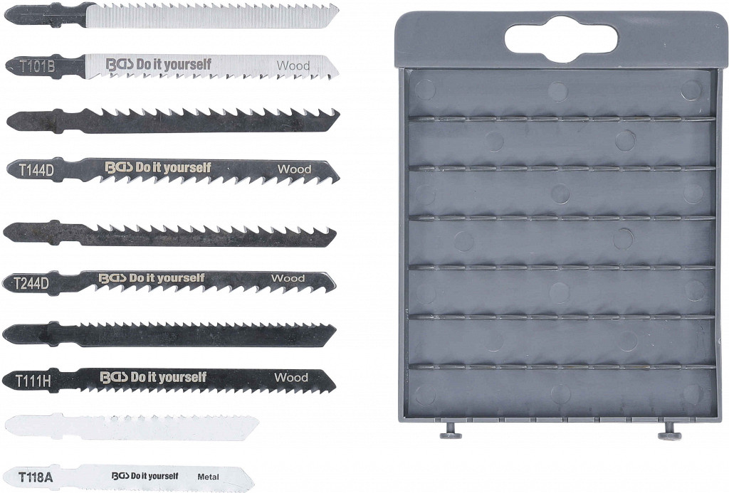 Primerno za vbodne žage Dewalt, Bosch, AEG, ELU, Festo, Makita, Metabo, v plastičnem kovčku, obseg dobave: 1 žagin list 76 mm za aluminij 1–3 mm, 1 žagin list 76 mm za aluminij 4–6 mm, 2 žagina lista 100 mm za plastiko, 2 žagina lista 100 mm za ravno hitro žaganje lesa, 2 žagina lista 100 mm za ukrivljeno hitro žaganje lesa, 2 žagina lista 100 mm za fino ravno žaganje lesa