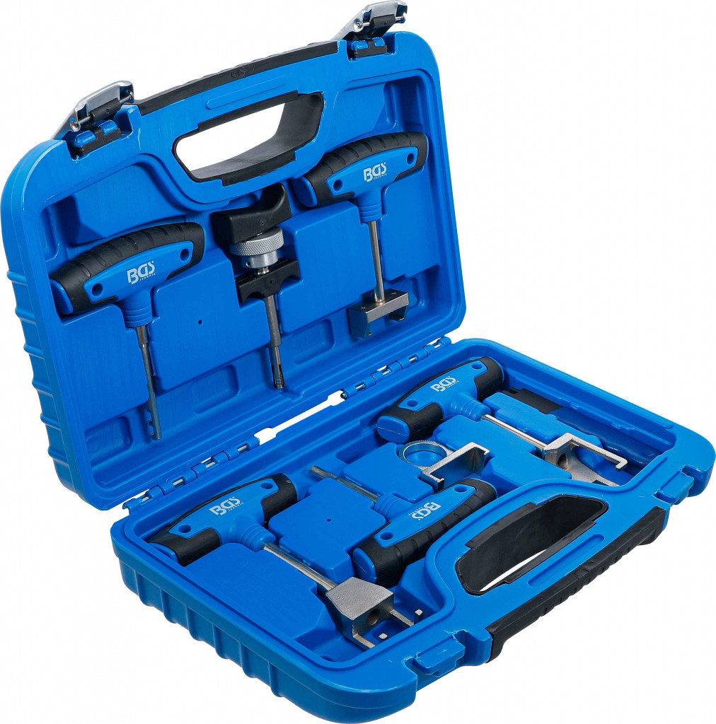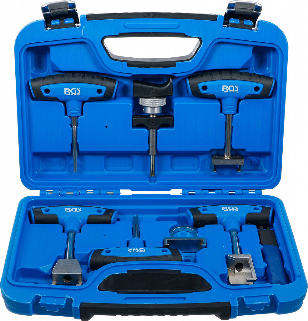 Komplet orodij za odstranjevanje tuljav za vžig in modulov pri motorjih VW, Audi, Seat in Škoda (1.2–5.2 l). Vključuje tudi orodje za plastične oljne čepke pri novejših motorjih VAG. Priloženih 5 orodij za tuljave, orodje za vtiče, ključ za olje in orodje za odklop.