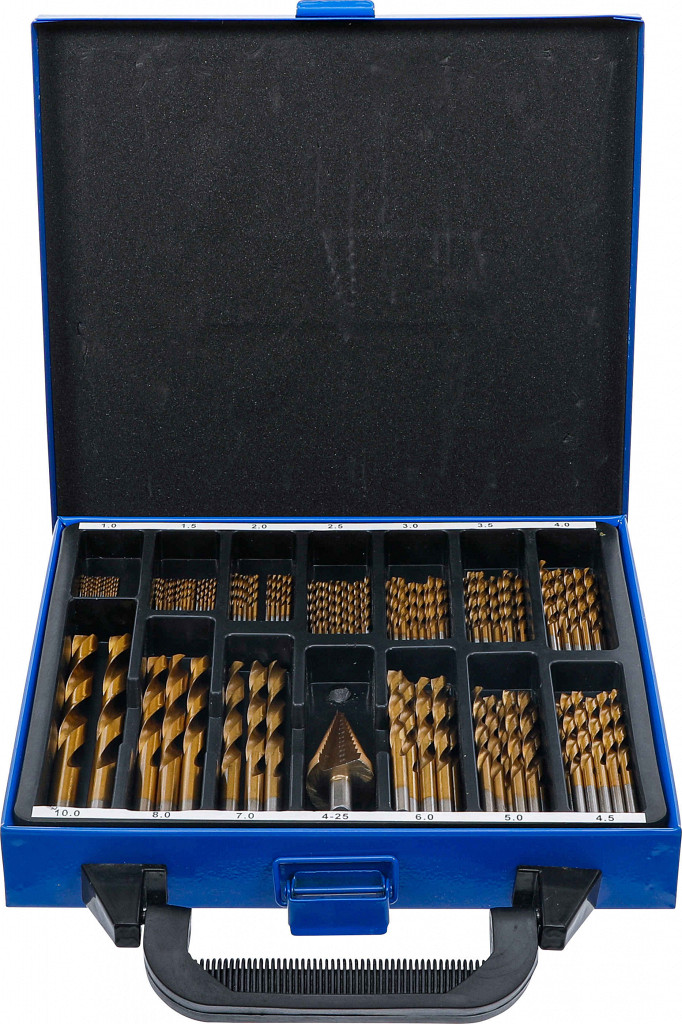 Proizvedeno po DIN 338; brušeni robovi; vsebuje naslednje svedre: 15 x Ø 1,0 mm, 15 x Ø 1,5 mm, 10 x Ø 2,0 mm, 10 x Ø 2,5 mm, 12 x Ø 3,0 mm, 10 x Ø 3,5 mm, 12 x Ø 4,0 mm, 10 x Ø 4,5 mm, 8 x Ø 5,0 mm, 8 x Ø 6,0 mm, 3 x Ø 7,0 mm, 3 x Ø 8,0 mm, 2 x Ø 10,0 mm; stopničasti sveder 1 x Ø 4 - 25 mm.