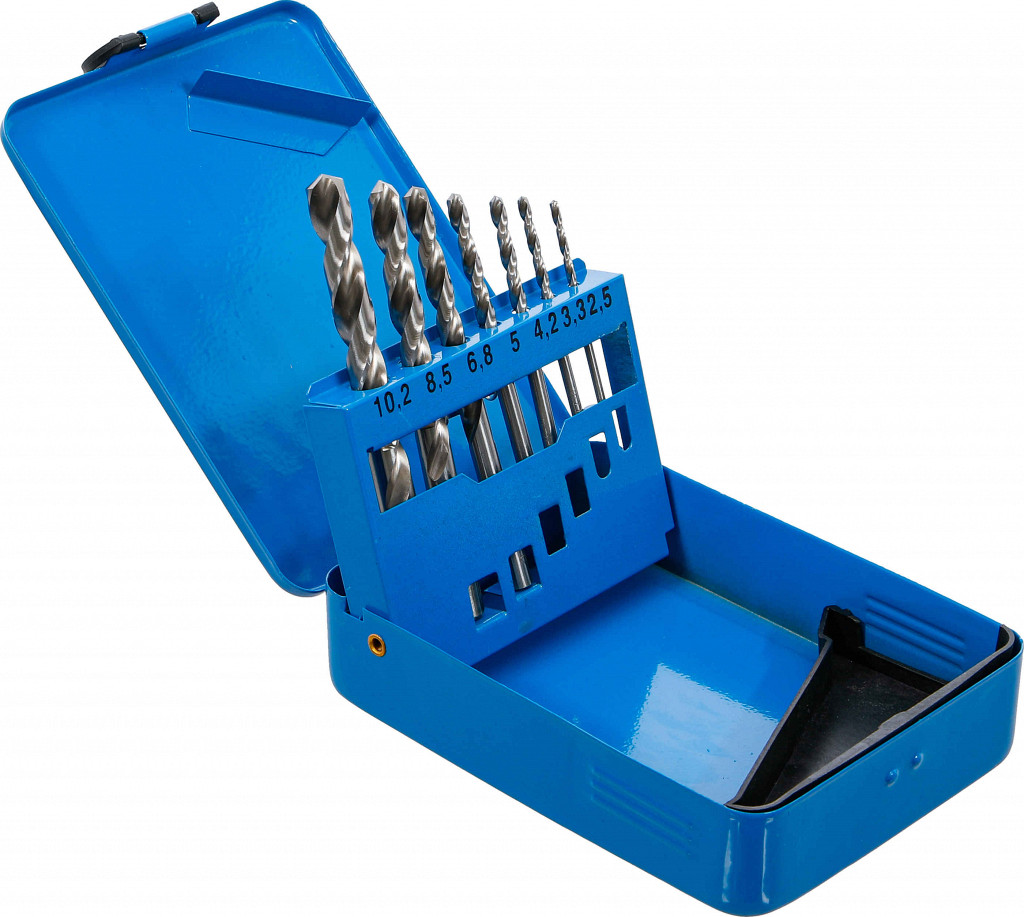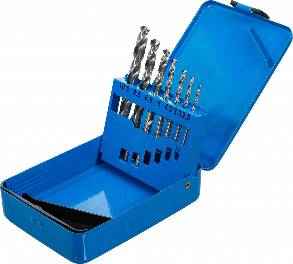 Set spiralnih svedrov z ostrim kotom 135°, križno brušeni, za jedrne luknje velikosti 2.5 - 3.3 - 4.2 - 5.0 - 6.8 - 8.5 - 10.2 mm.