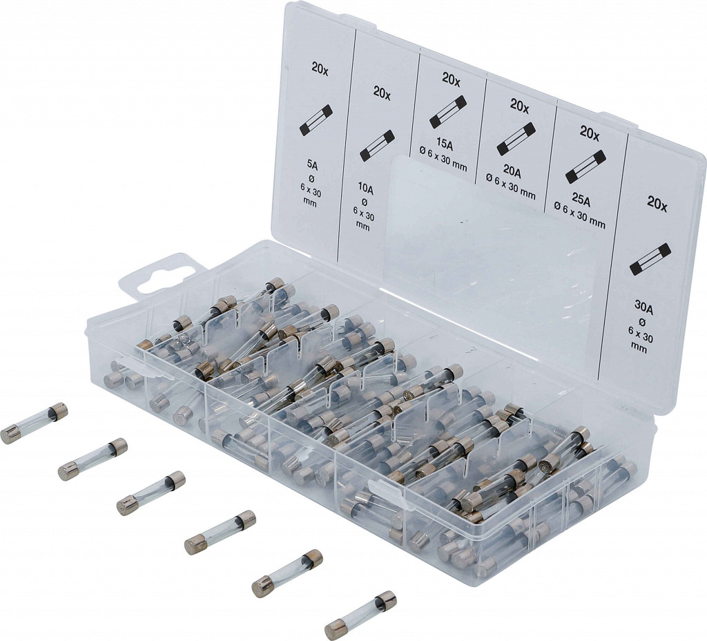V plastičnem kovčku; sprožilne lastnosti: prazni tek; obseg dobave: 20 steklenih varovalk 5A Ø 6×30 mm; 20 steklenih varovalk 10A Ø 6×30 mm; 20 steklenih varovalk 15A Ø 6×30 mm; 20 steklenih varovalk 20A Ø 6×30 mm; 20 steklenih varovalk 25A Ø 6×30 mm; 20 steklenih varovalk 30A Ø 6×30 mm.