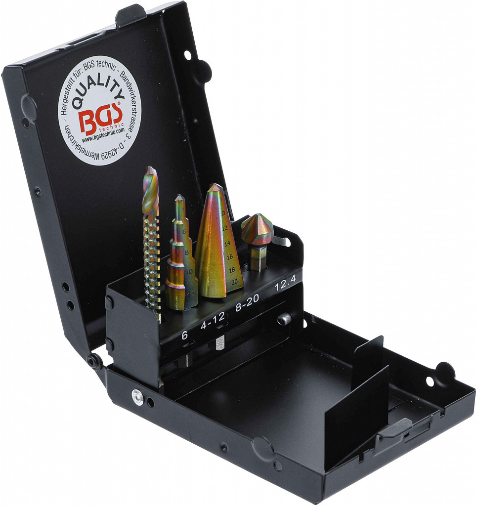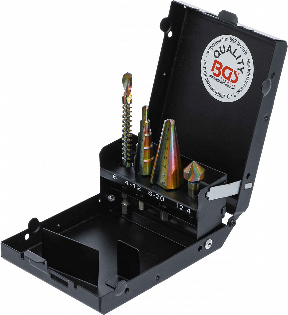 Stopničasto svedro 4 - 12 mm; Izrezovalnik lukenj 8 - 20 mm; Žagasti sveder 6 x 90 mm; Povrtalo 12,4 mm