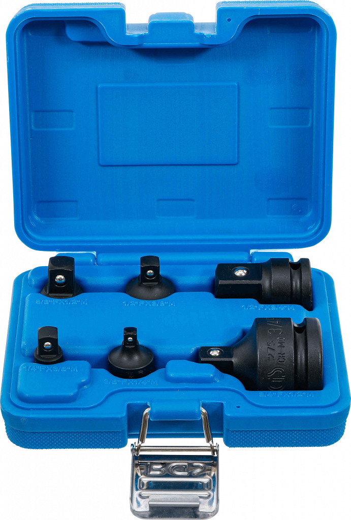 Primeren za ročne in udarne vijačnike, lahko se pritrdi na udarni vijačnik s pomočjo zatiča in O-obroča. Vsebina: 1 adapter 6,3 mm (1/4") notranji pogon – 10 mm (3/8") zunanji kvadrat, max. navor 60 Nm; 1 adapter 10 mm (3/8") notranji pogon – 6,3 mm (1/4") zunanji kvadrat, max. navor 60 Nm; 1 adapter 10 mm (3/8") notranji pogon – 12,5 mm (1/2") zunanji kvadrat, max. navor 200 Nm; 1 adapter 12,5 mm (1/2") notranji pogon – 10 mm (3/8") zunanji kvadrat, max. navor 200 Nm; 1 adapter 12,5 mm (1/2") notranji pogon – 20 mm (3/4") zunanji kvadrat, max. navor 500 Nm; 1 adapter 20 mm (3/4") notranji pogon – 12,5 mm (1/2") zunanji kvadrat, max. navor 500 Nm.