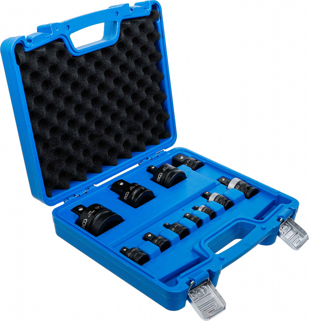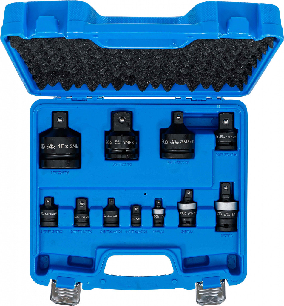 Primerno za ročne in udarne raglje. Možnost pritrditve na udarno ragljo s pomočjo zatiča in O-obroča. Vsebina: adapterji 6.3 mm (1/4") – 10 mm (3/8"), 10 mm (3/8") – 6.3 mm (1/4"), 10 mm (3/8") – 12.5 mm (1/2"), 12.5 mm (1/2") – 10 mm (3/8"), 12.5 mm (1/2") – 20 mm (3/4"), 20 mm (3/4") – 12.5 mm (1/2"), 20 mm (3/4") – 25.4 mm (1"), 25.4 mm (1") – 20 mm (3/4"), ter 3 kardanski zglobi 6.3 mm (1/4"), 10 mm (3/8"), 12.5 mm (1/2").