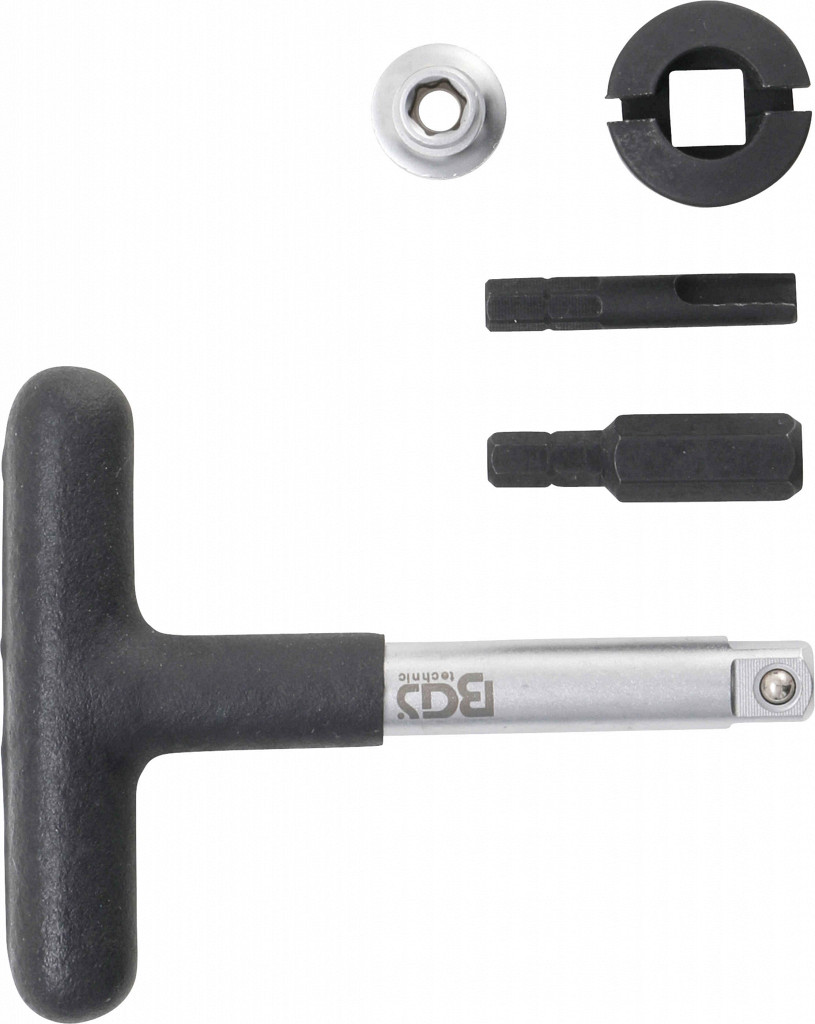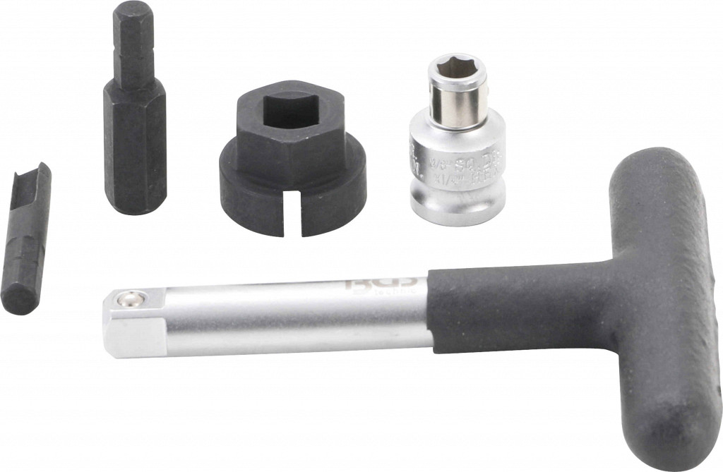 Komplet posebnih profilnih nastavkov z ročajem v obliki črke T za montažo in demontažo plastičnih čepov oljnih korit. Visoka natančnost prileganja. Primerno za PSA, BMW, VAG in Ford. Vključuje ročaj, držalo bitov in posebne nastavke.