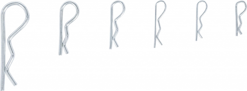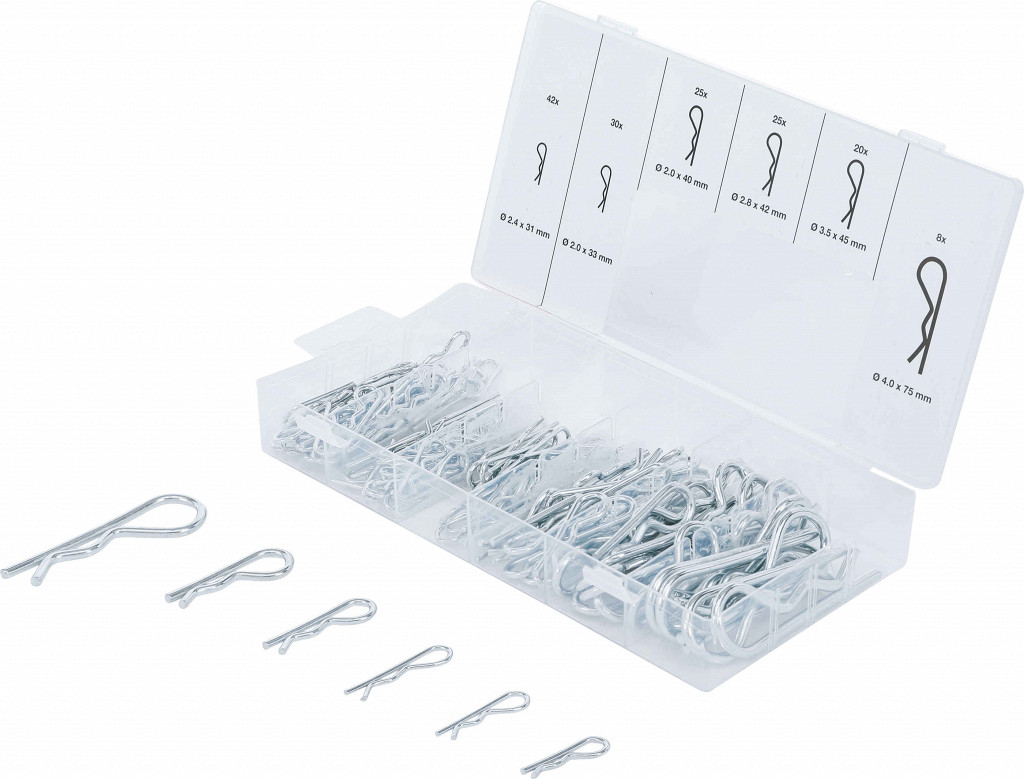 Komplet osnih varnostnih obročkov iz vzmetnega jekla #70 v plastični škatli. Vsebina: 42 kosov Ø 2,4 x 31 mm, 30 kosov Ø 2,0 x 33 mm, 25 kosov Ø 2,0 x 40 mm, 25 kosov Ø 2,8 x 42 mm, 20 kosov Ø 3,5 x 45 mm, 8 kosov Ø 4,0 x 75 mm.