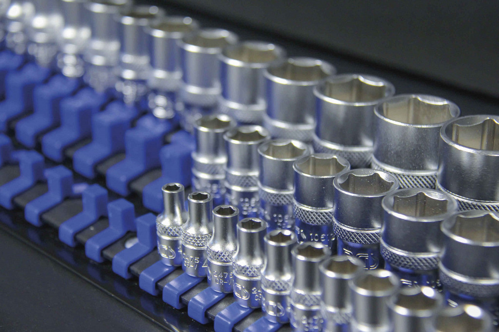 Praktično shranjevanje za nasadke. Vsebina: 80 sponk z varnostno kroglico (26 kosov 1/4", 30 kosov 3/8", 24 kosov 1/2"), 4 nosilne letve, pritrdilna plošča.