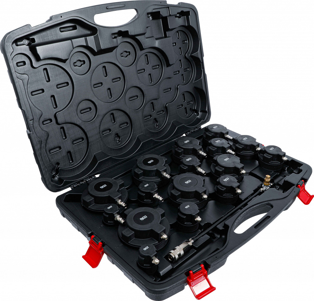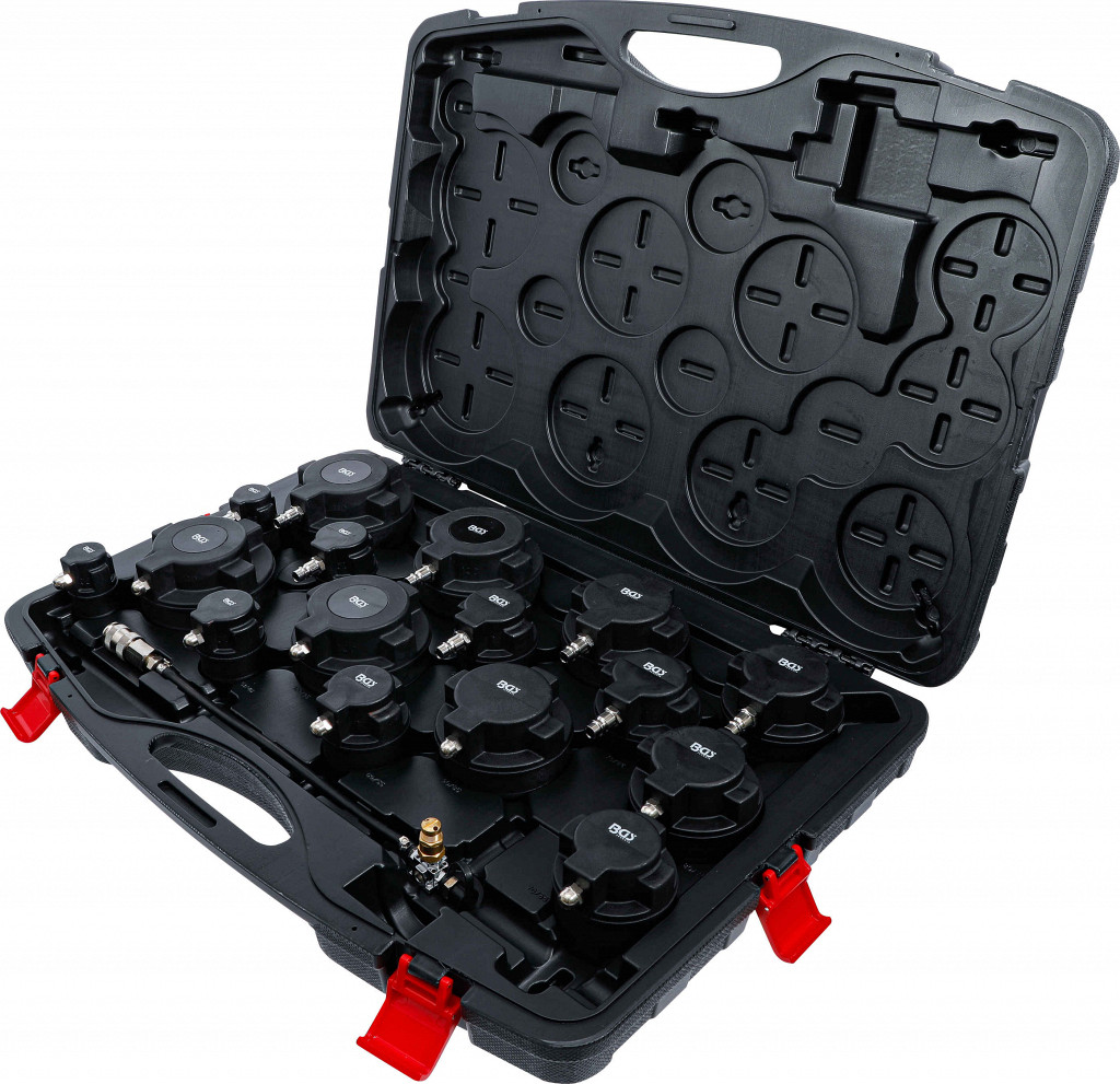 Komplet za preverjanje tesnosti sistemov polnjenja zraka pri turbo motorjih (dizel in bencin). Uporaben tudi za EGR ventile. Primeren za cevi Ø 31–110 mm. Vključuje adapterje različnih velikosti in varnostni ventil.