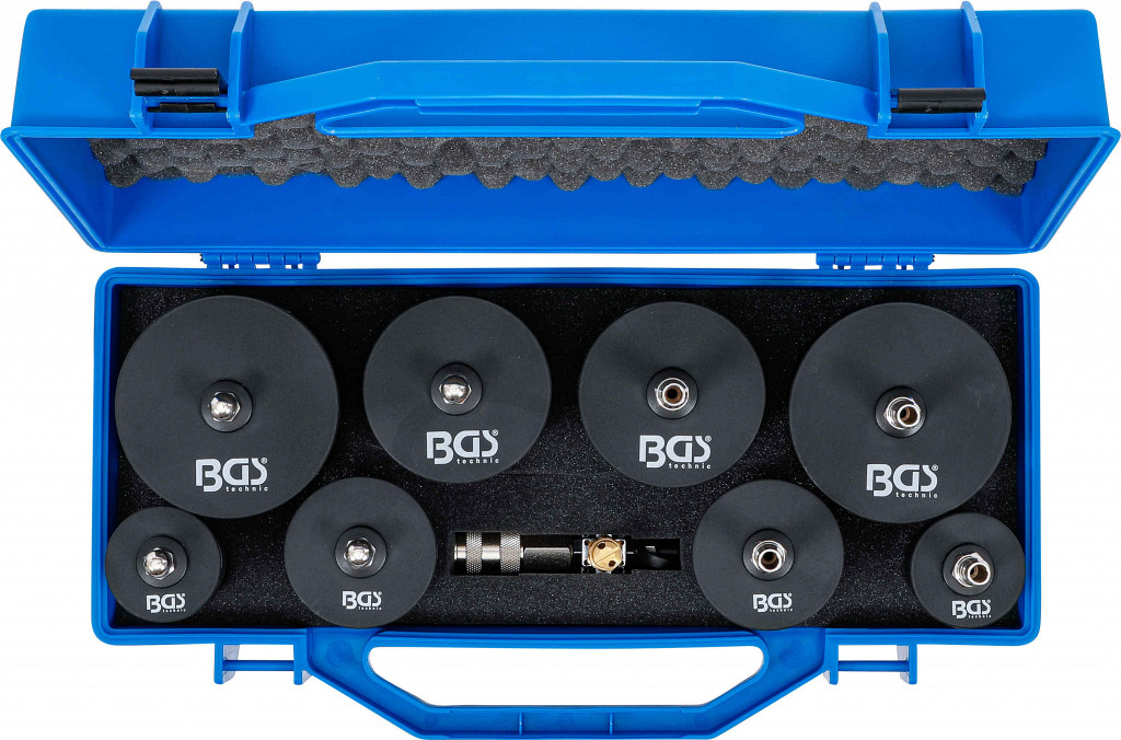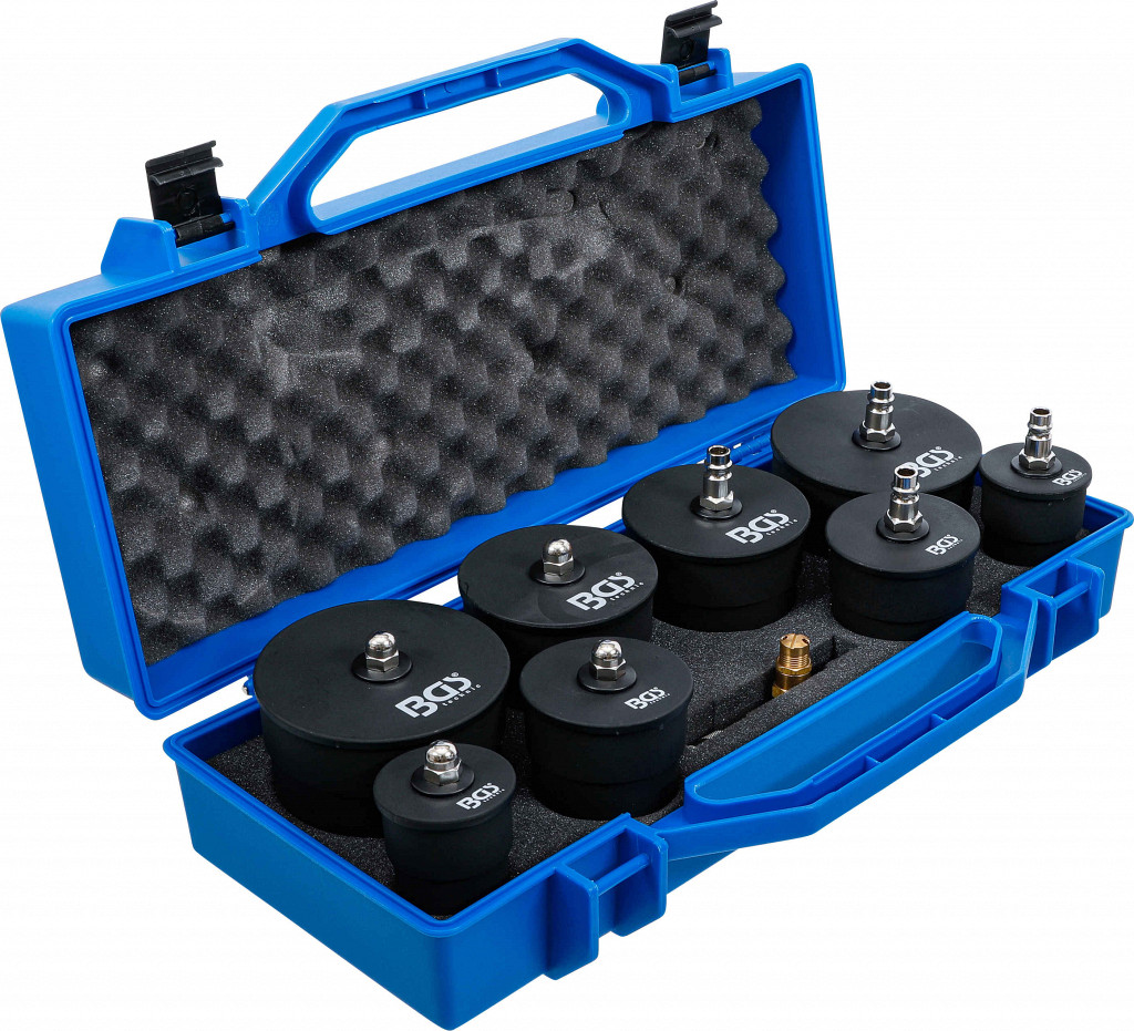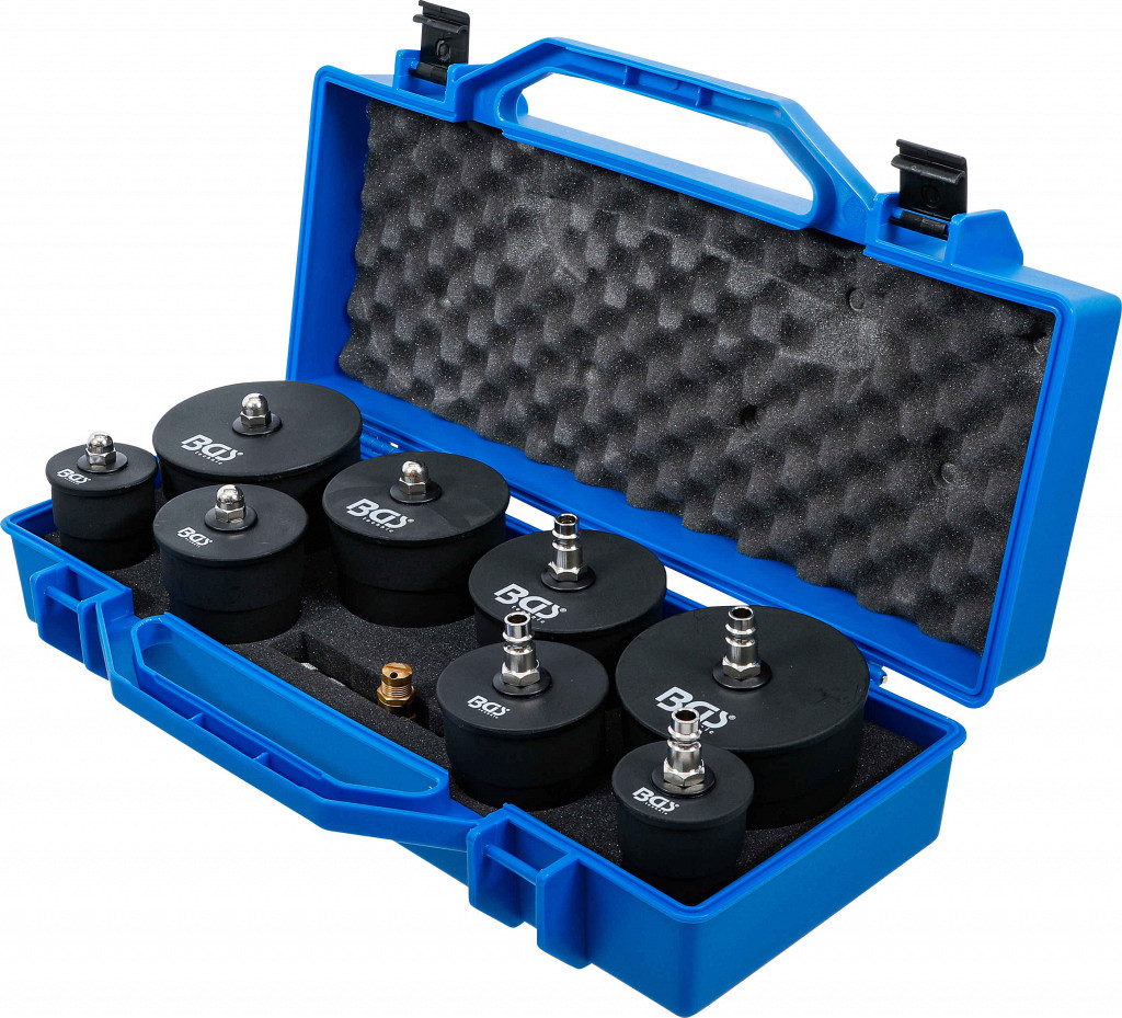 Tester tlačnega polnjenja za turbopolnilnike, kompresorje in cevi polnilnega sistema. Preprečuje previsok tlak, primeren za iskanje puščanj. Vključuje 4 pare...