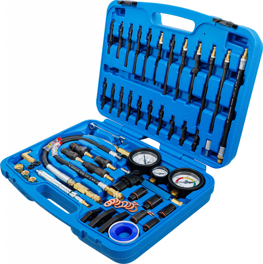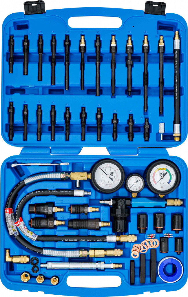 Tester kompresije za večino bencinskih in modernih HDi, TDCi ter starejših dizelskih motorjev, z možnostjo merjenja do 50 bar. Vključuje hitre spojke (ravne in pod kotom), manometre z gumijasto zaščito, adapterje za žarilne in vžigalne svečke ter injektorje. Primeren za avtomobile, tovornjake, avtobuse, kmetijske in ladijske motorje, dodatni manometer omogoča test padca tlaka.