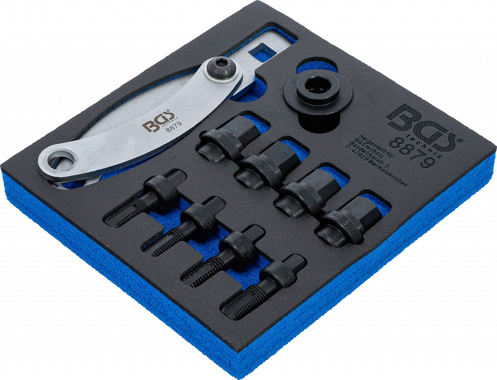 Komplet za enostavno montažo koles brez dodatne osebe. Vključuje protidržalno orodje, tlačno pušo z ležajem, montažne matice različnih dimenzij ter orodja za obnovo navojev.